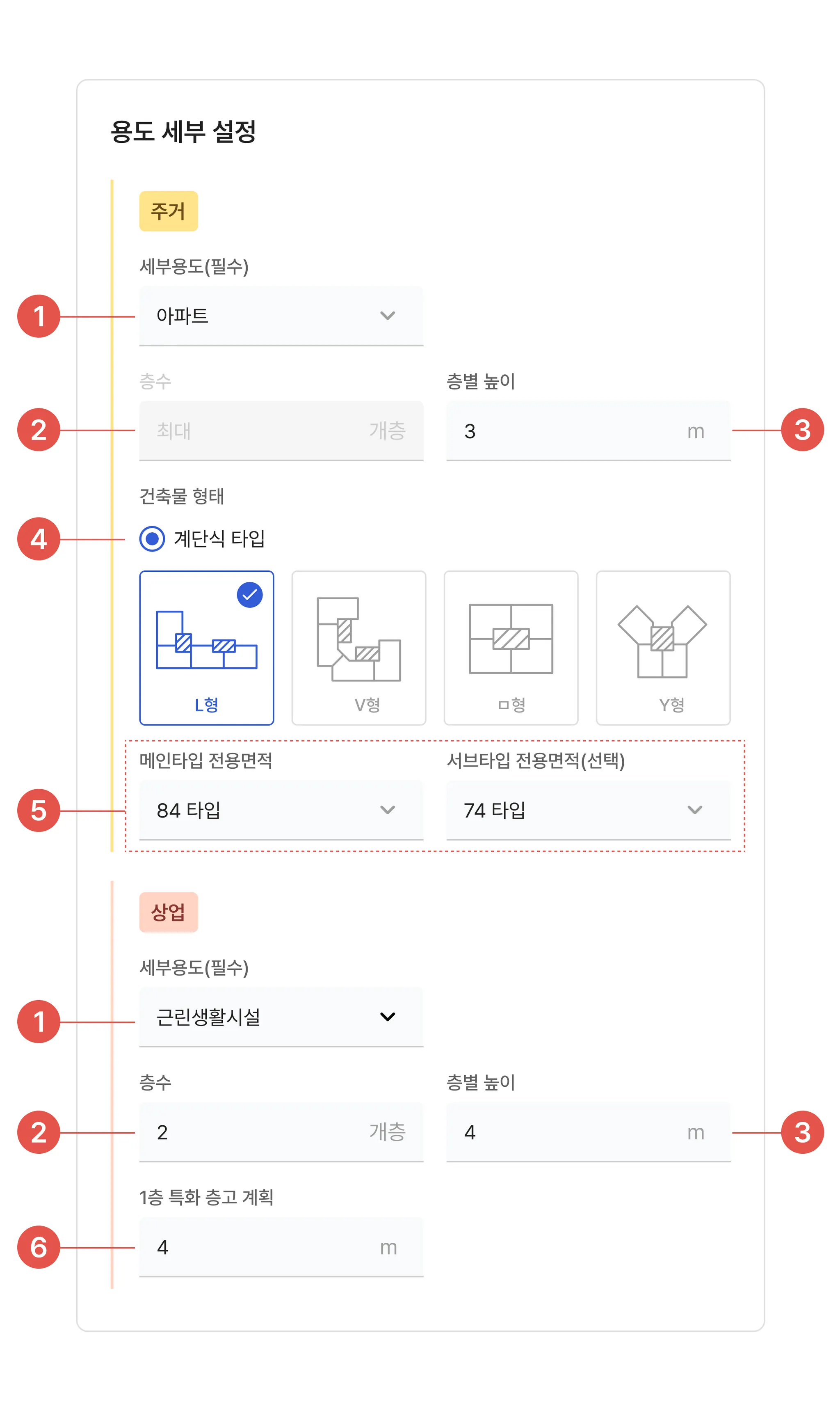 용도/복합용도 선택 후 각 용도의 세부 용도를 설정합니다.