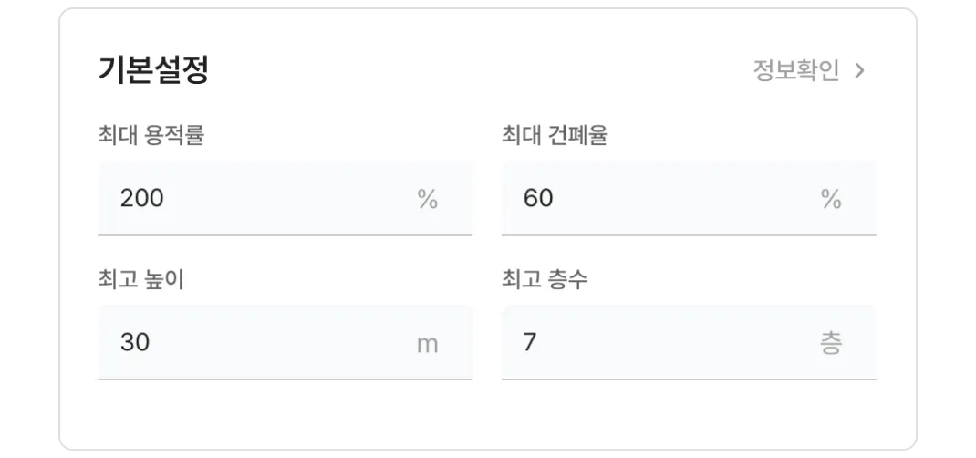 용적률, 건폐율, 높이, 층수 등 건축물의 규모에 대한 기본 설정값을 추가적으로 조절할 수 있습니다.