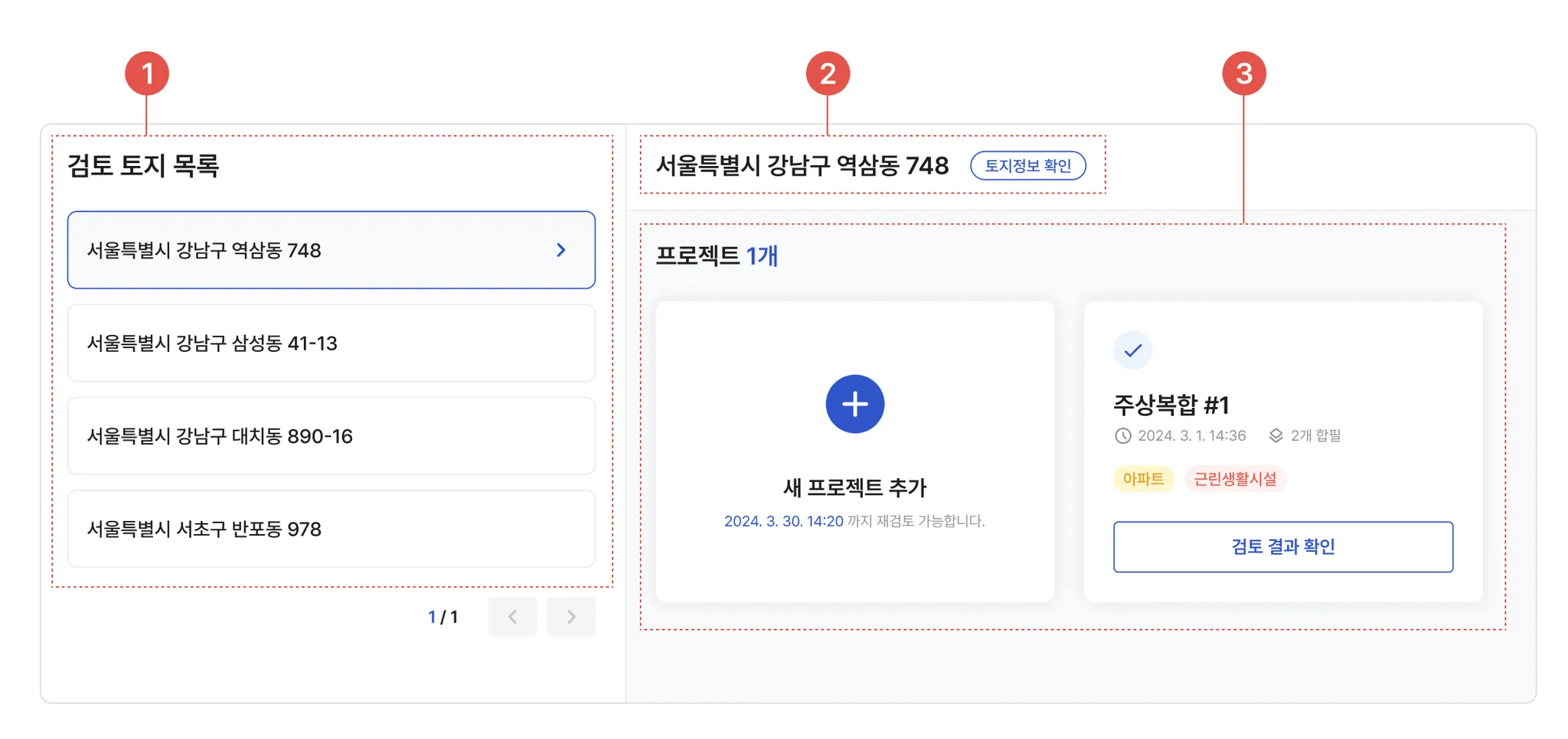 기획설계 한 토지들의 목록에서 각 토지의 정보와 기획설계안을 확인할 수 있습니다.