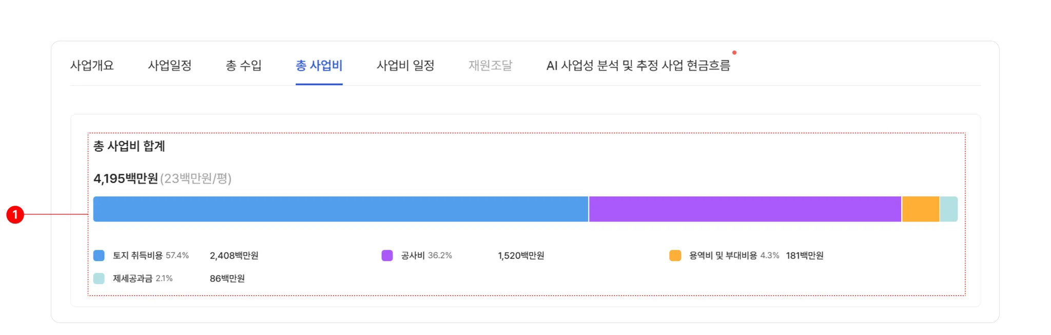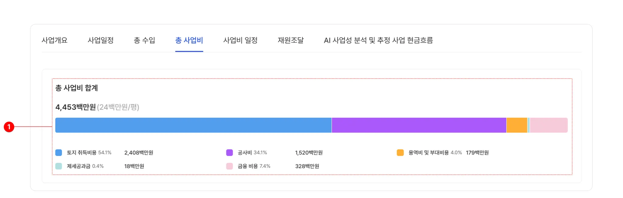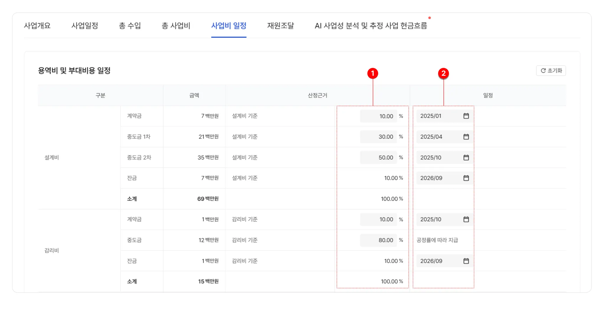 사업비 일정: 토지 취득 비용 및 용역비 및 부대비용의 일정 및 비율을 설정하실 수 있습니다