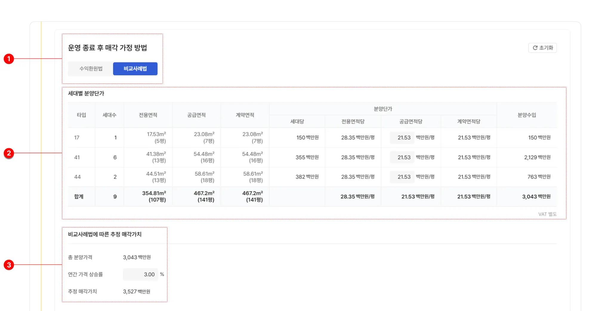 각 세대별 임대료 및 분양단가를 설정하실 수 있습니다