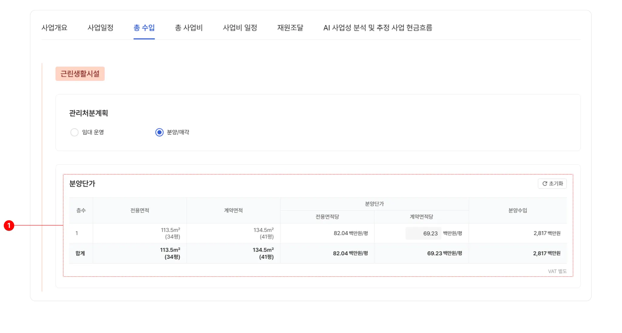 총 수입: 개발사업에서 가정하는 총 수입을 설정하실 수 있습니다