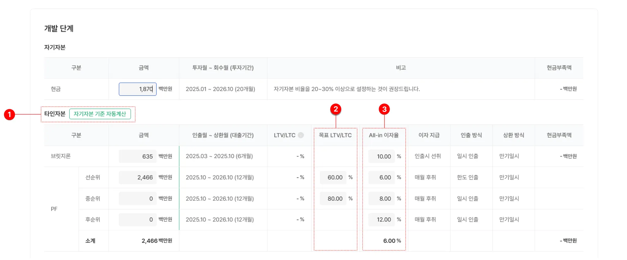 자기자본(현금 + 토지 기보유시 토지비)를 기준으로 목표 LTC/LTC와 이자율을 고려하여 타인자본을 자동계산합니다