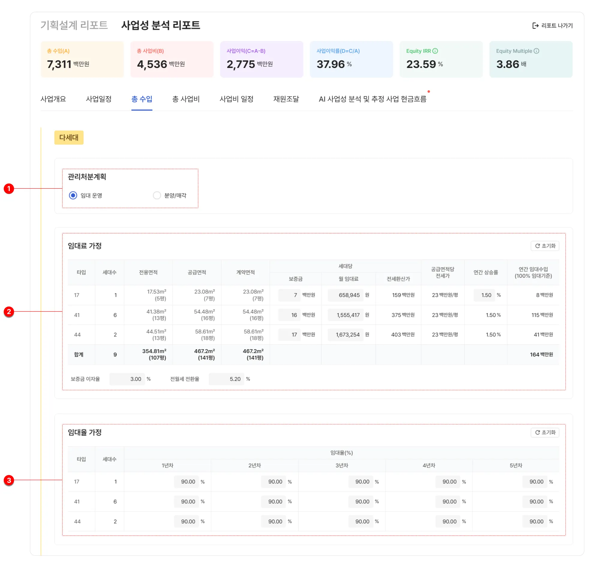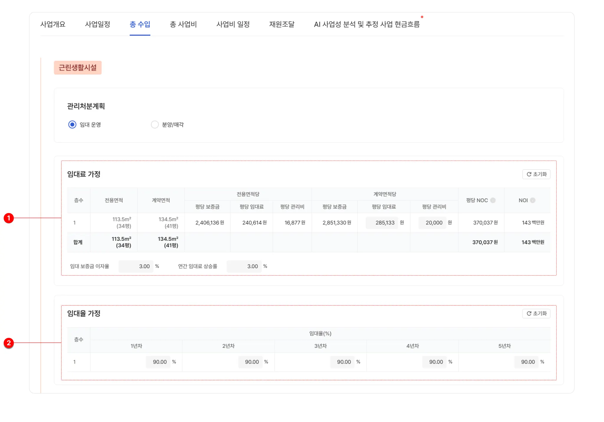 2. 임대료 가정: 세대타입별 보증금 및 월 임대료를 설정할 수 있습니다
