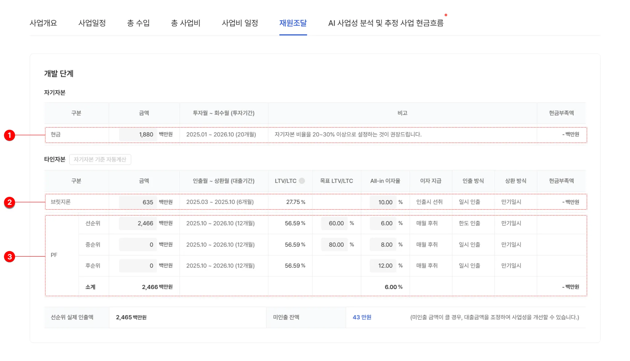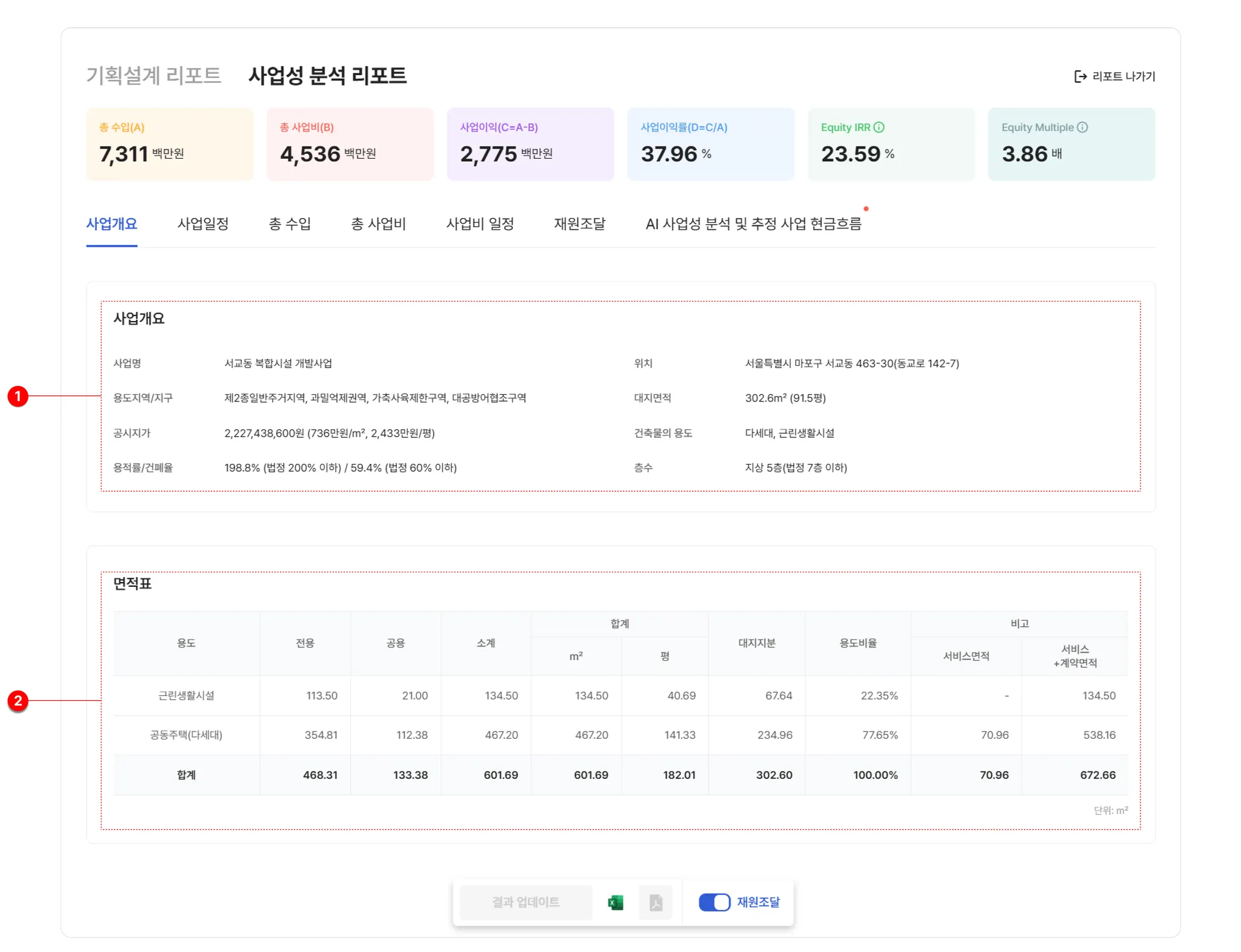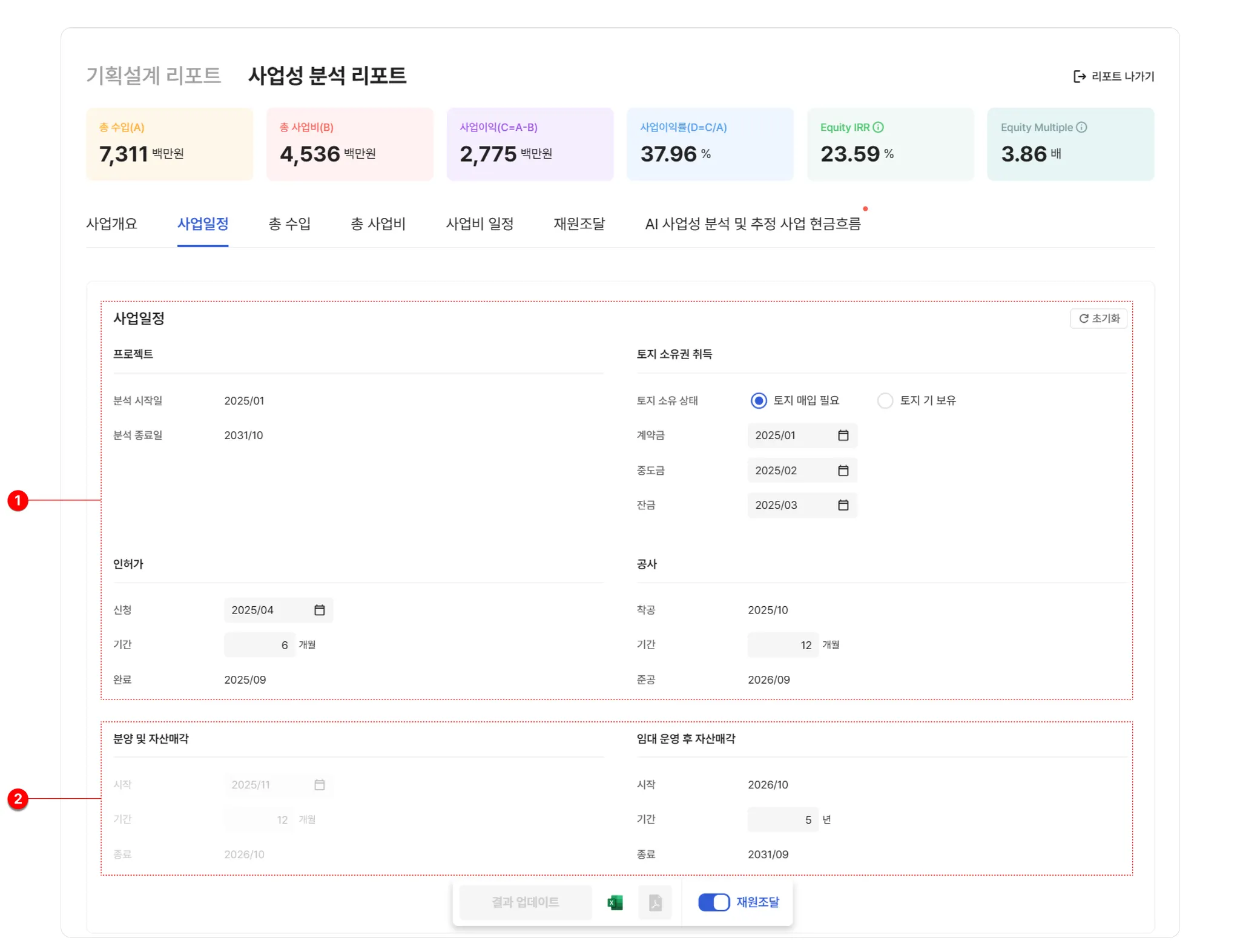 2. 사업성분석 결과: 재원조달 고려에 따라 사업성 분석에 필요한 지표를 제공합니다.