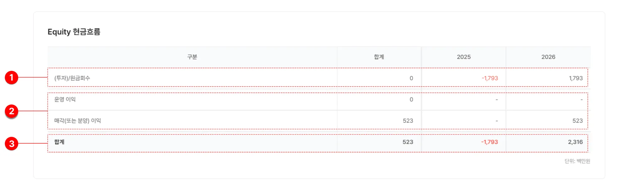건축물 완공전까지 현금부족액이 발생할 경우 현금부족액 이 표기되며, Equity IRR 및 Equity Multiple 지표가 산출되지 않습니다