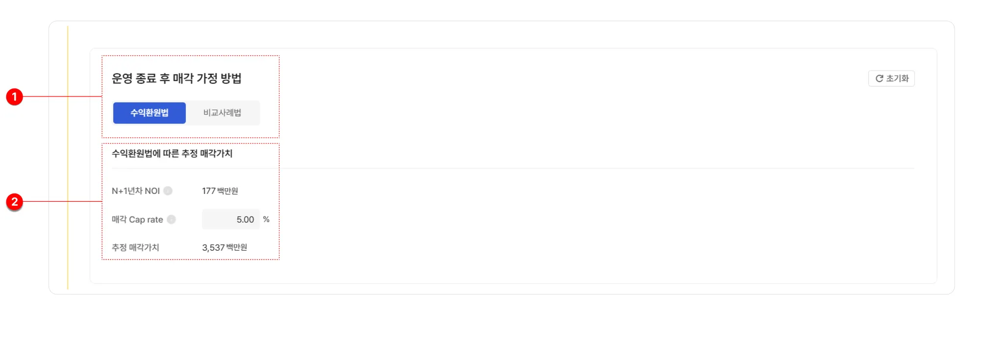 임대운영시 자기자본은 개발단계와 동일하게 기본값으로 제공되나 수정 가능합니다
