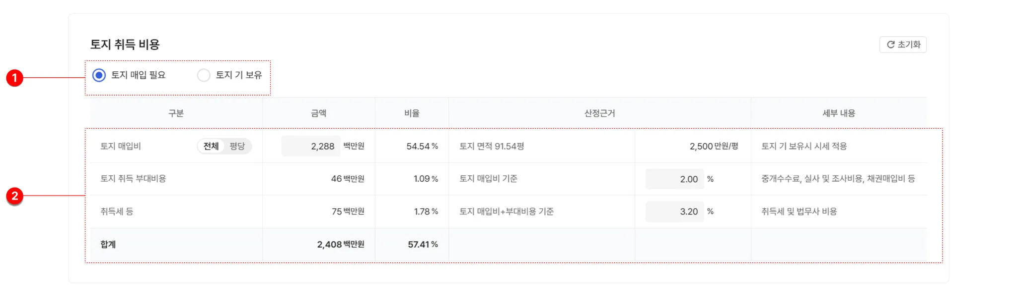 토지취득비용, 공사비, 용역 및 부대비용, 제세공과금 등을 설정하실 수 있습니다
