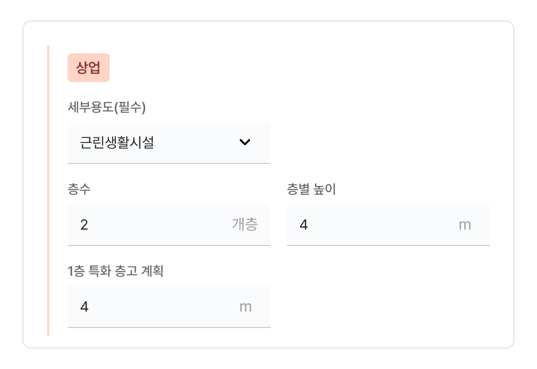 용도선택(주거+상업) 이후, 각각의 용도별 세부 설정값을 지정합니다.