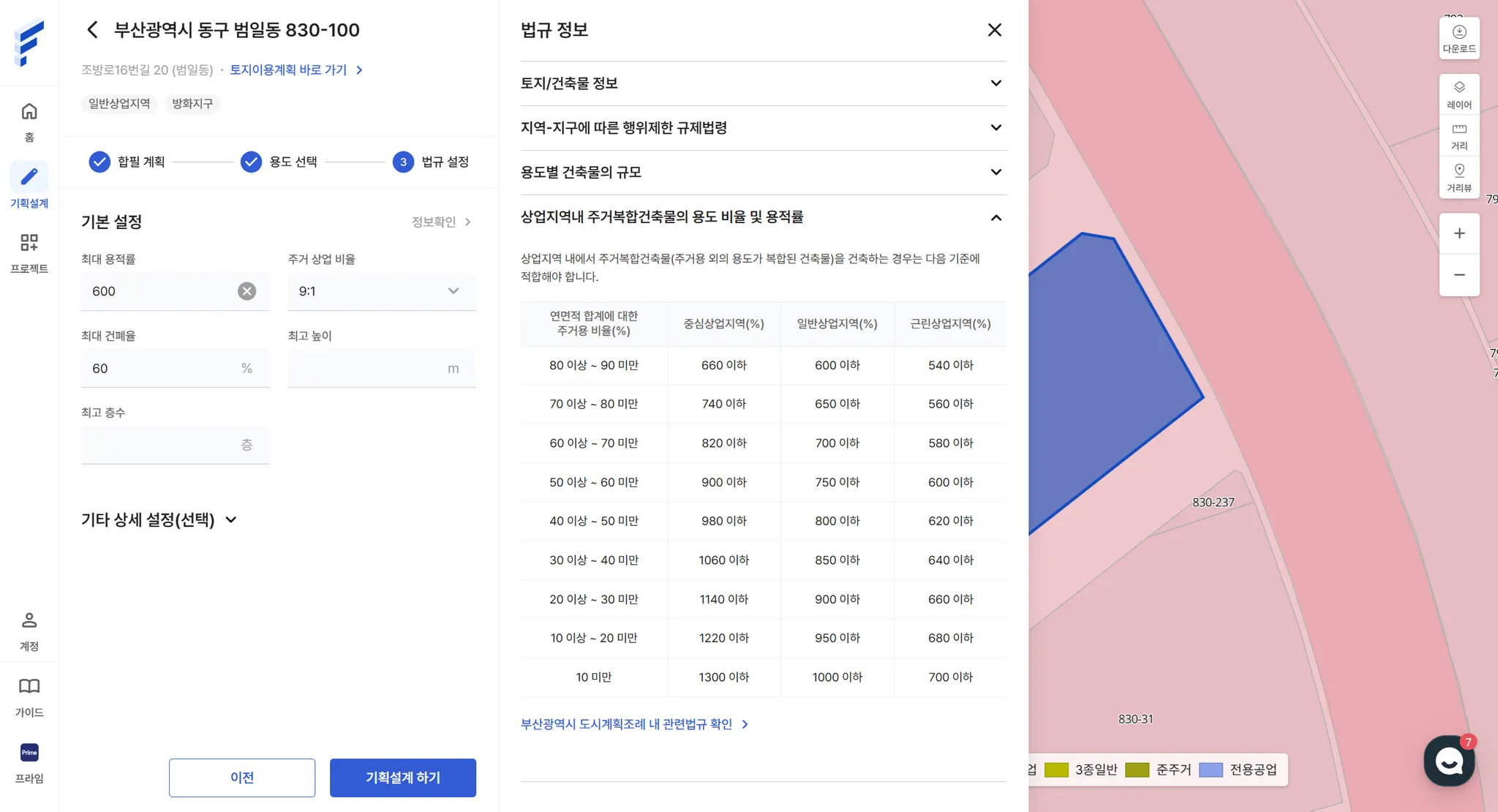 사용자가 앞서 설정한 주거·상업 비율과 비교하여, 계획안이 이를 충족하는지 여부를 자동으로 검토합니다.