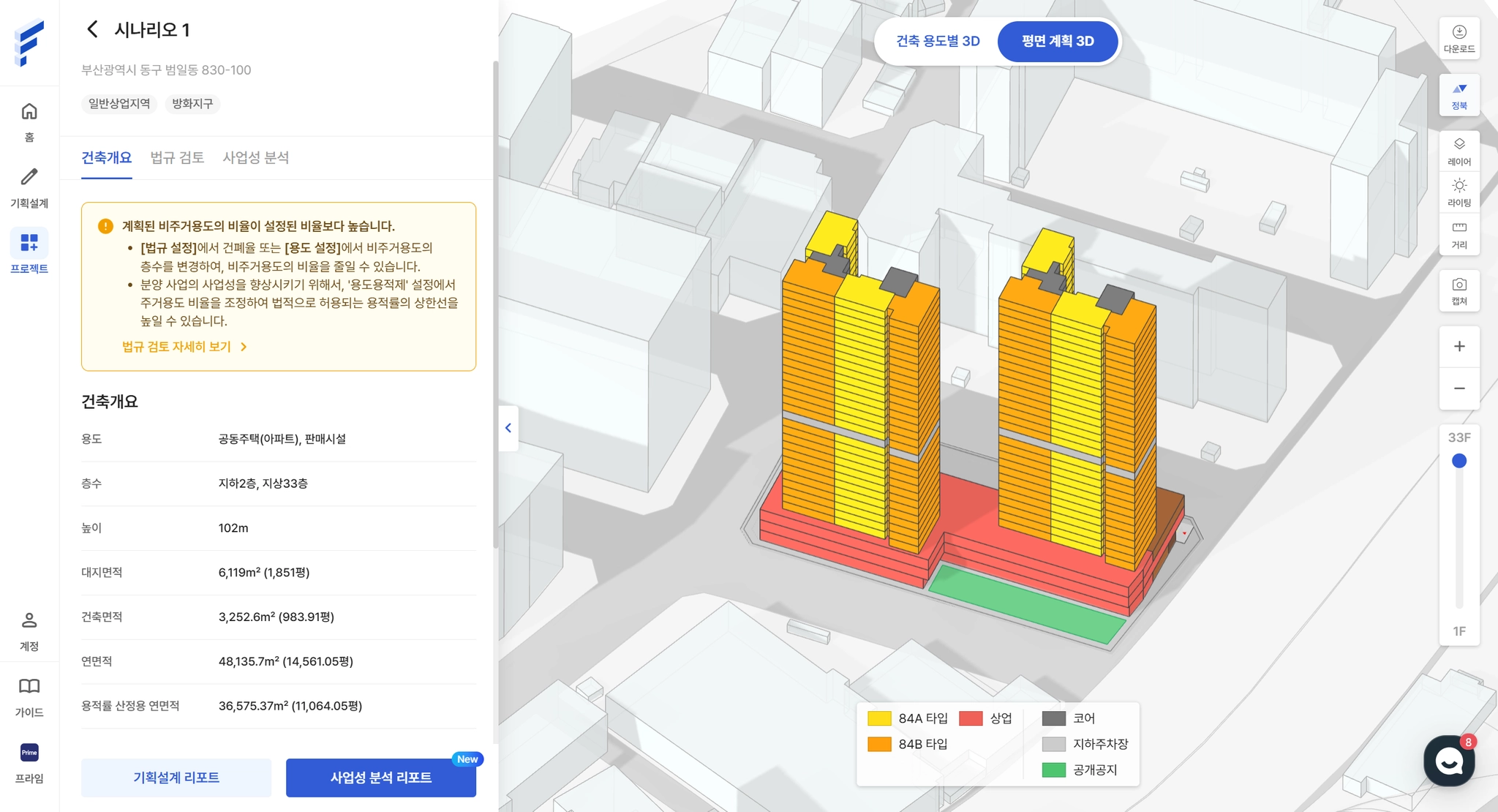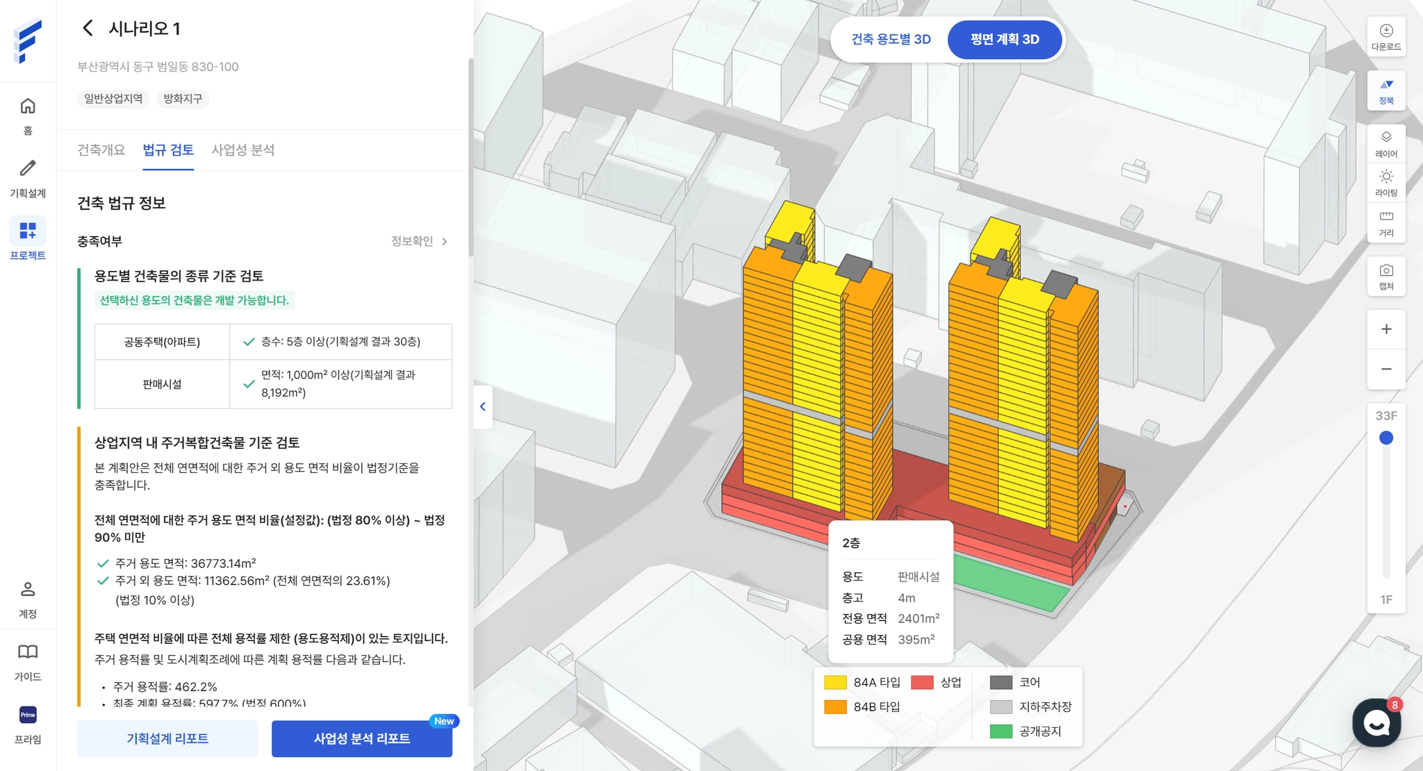 모든 설정이 완료된 후 “기획설계 실행”을 클릭하시면, 플렉시티가 주거상업비율이 고려된 최적의 주상복합 기획설계안을 도출합니다.