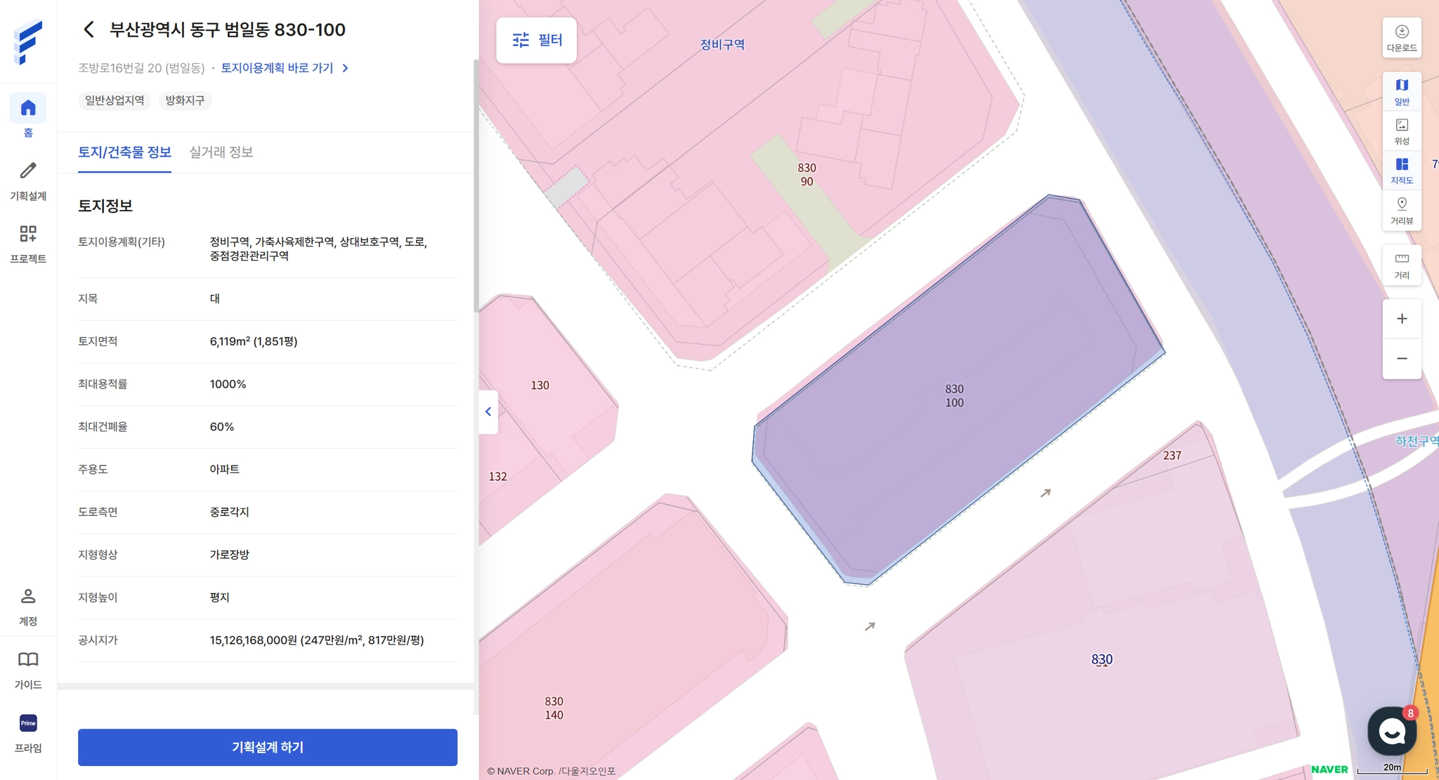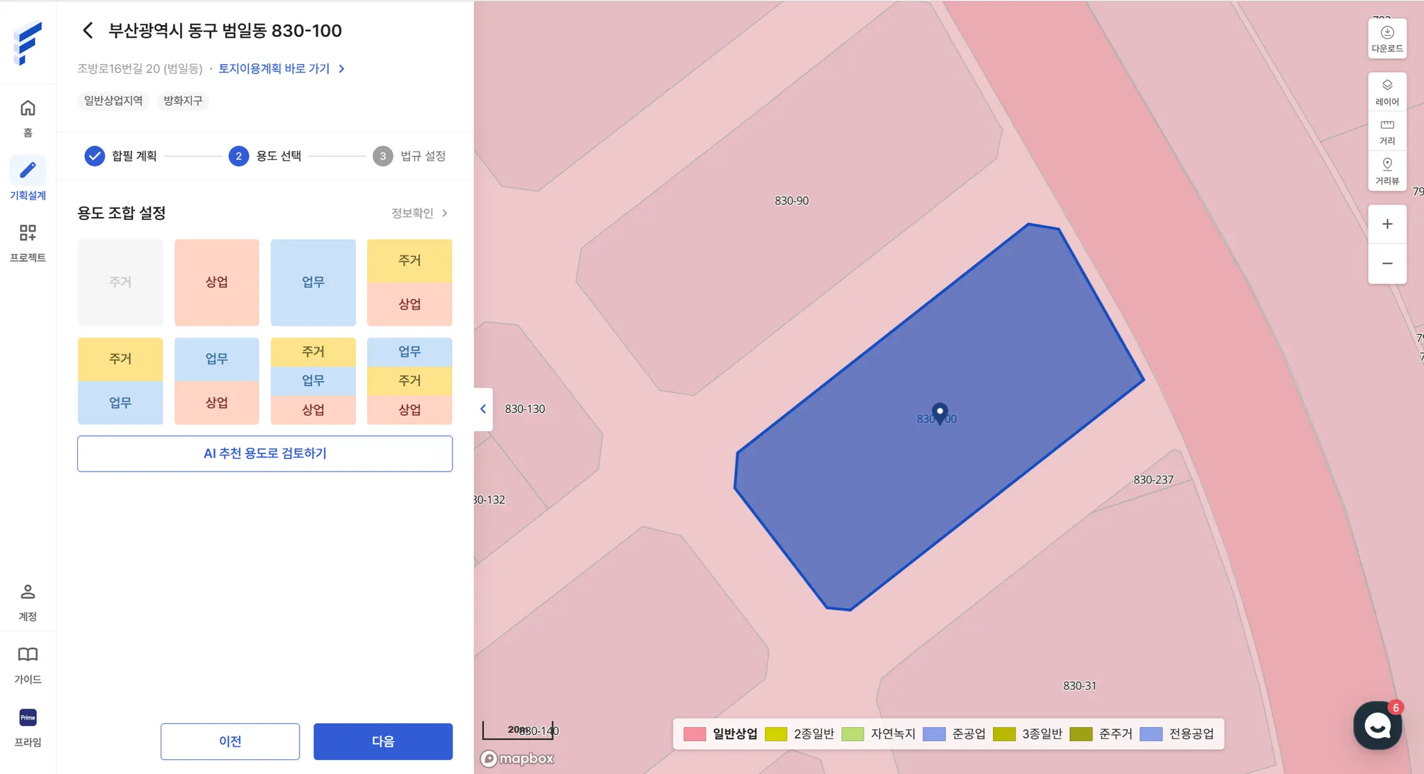기획설계 시 원하는 용도를 선택하거나 AI 추천을 통해 용도를 설정할 수 있습니다.