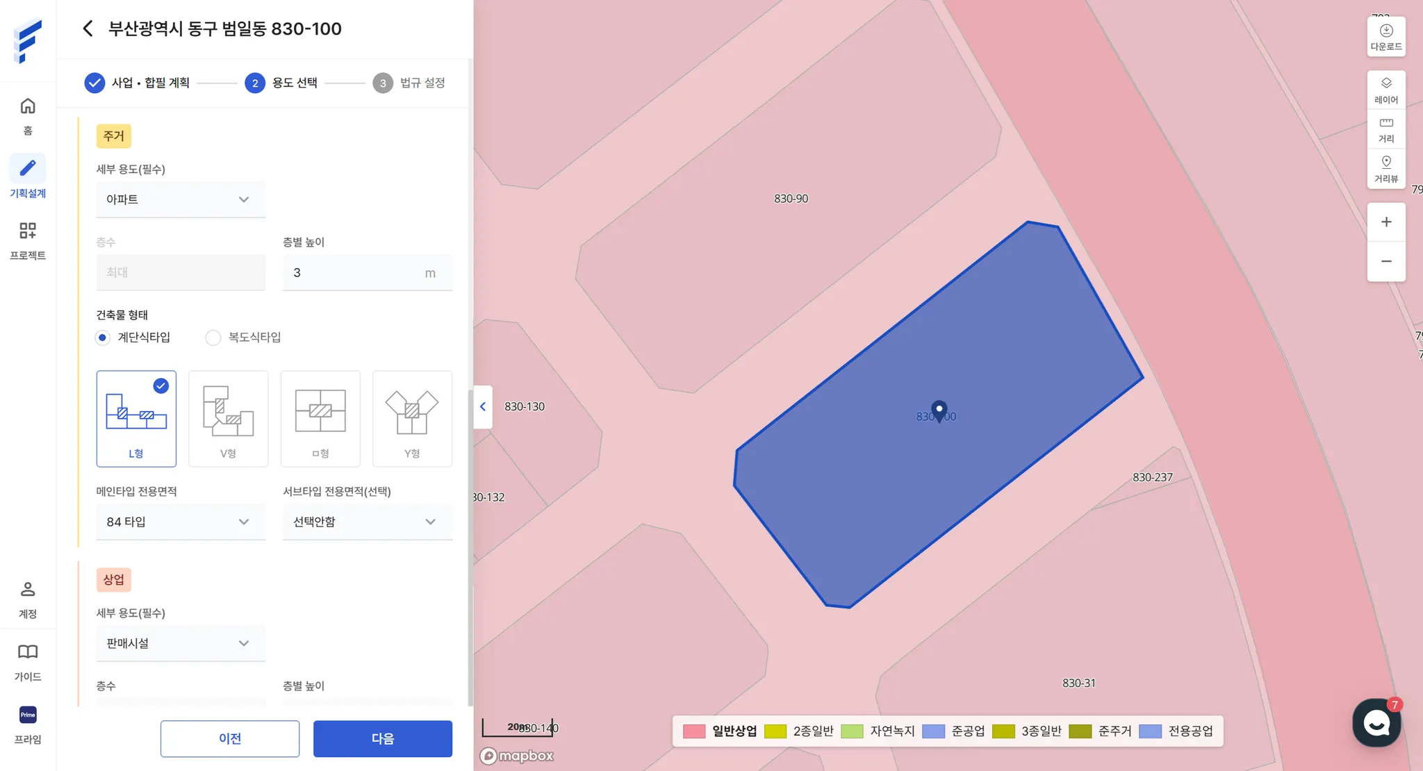 일반상업지역의 주상복합 기획에서는 2가지 전용면적 타입을 입력할 수 있습니다.