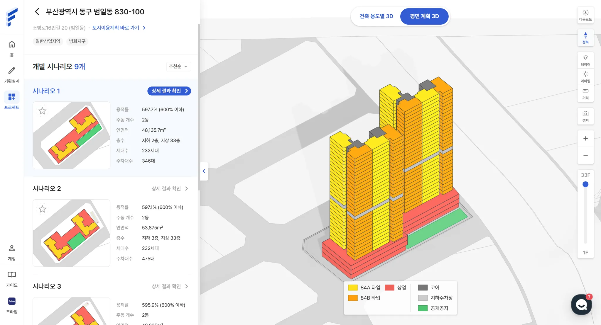 계획안은 플렉시티에서 추천하는 시나리오 순서대로 제공하며, 용적률 / 세대수 / 주동 개수 항목을 선택하여 원하는 항목 기준으로 시나리오를 순서대로 나열 할 수 있습니다.