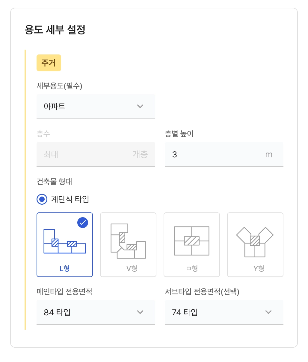 단일 용도 또는 복합 용도를 선택한 후, 각 용도에 대한 세부 항목을 개별적으로 설정할 수 있습니다.