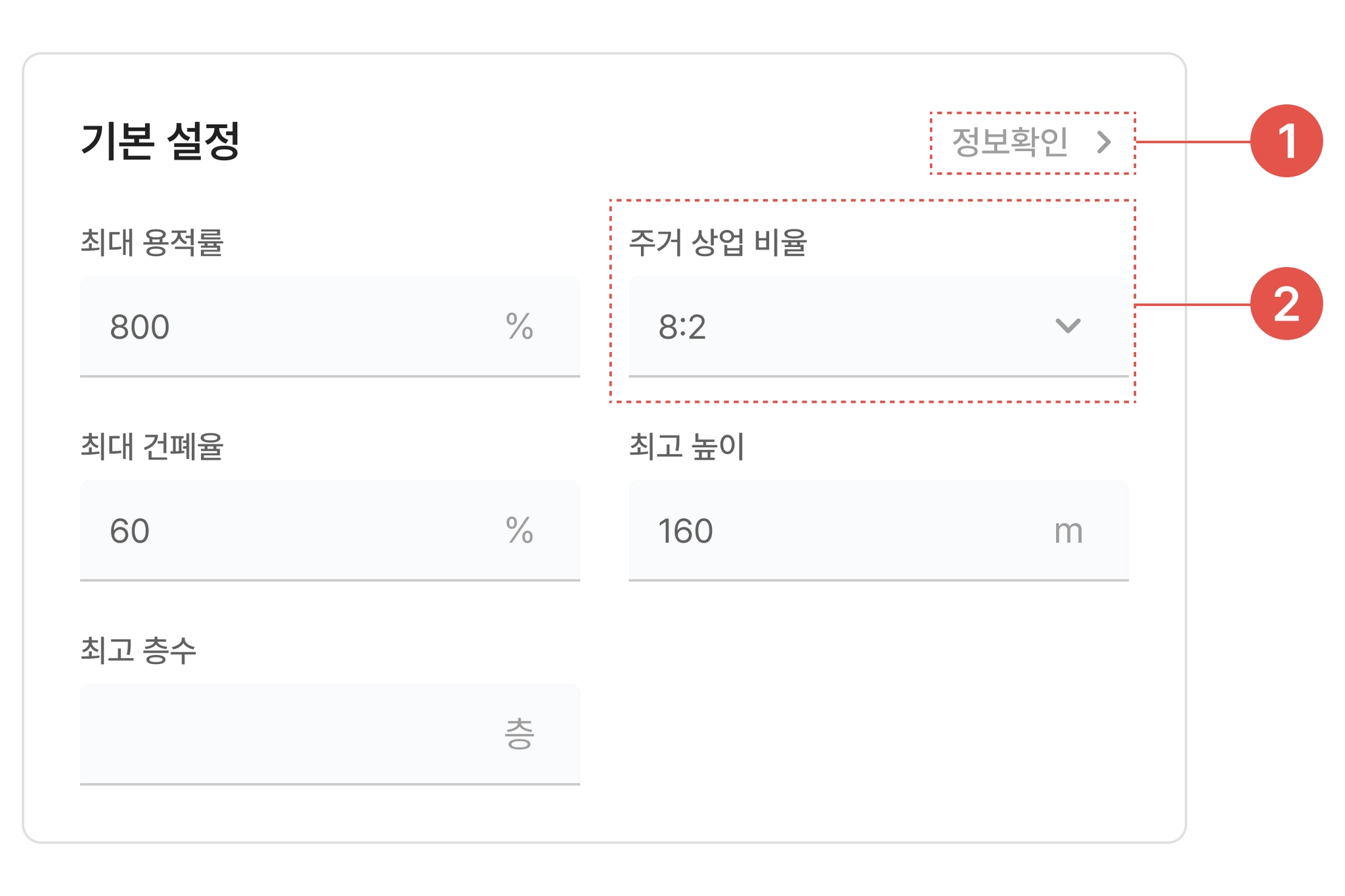 용적률, 건폐율, 높이, 층수 등 건축물의 규모에 대한 기본 설정값을 추가적으로 조절할 수 있습니다.