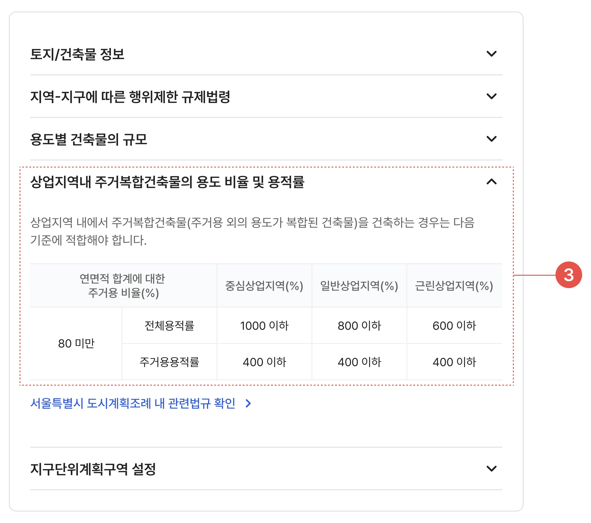 용도지역에 따라 적용되는 용적률, 건폐율 등의 법적 제한 기준을 확인할 수 있습니다.