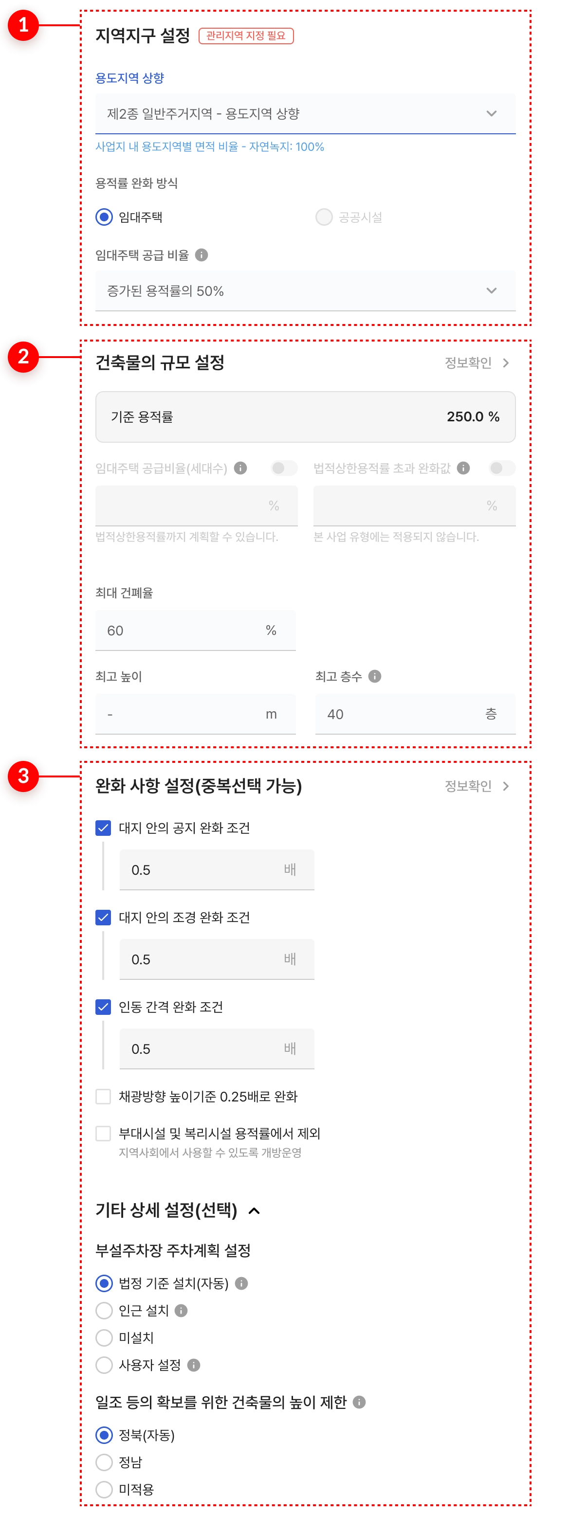 완화 사항 설정 및 기타 상세 설정은 주거지역과 동일하게 적용합니다.