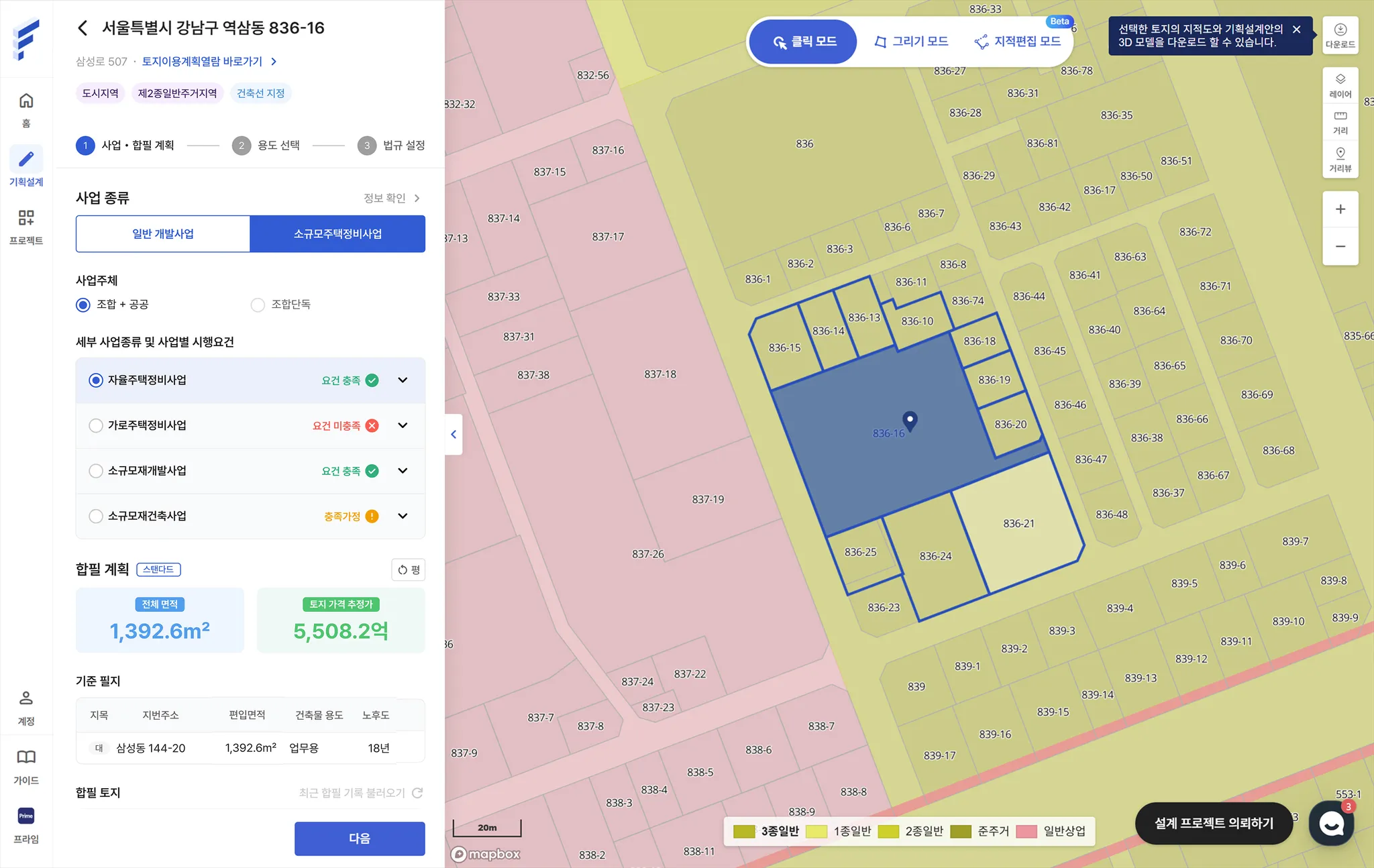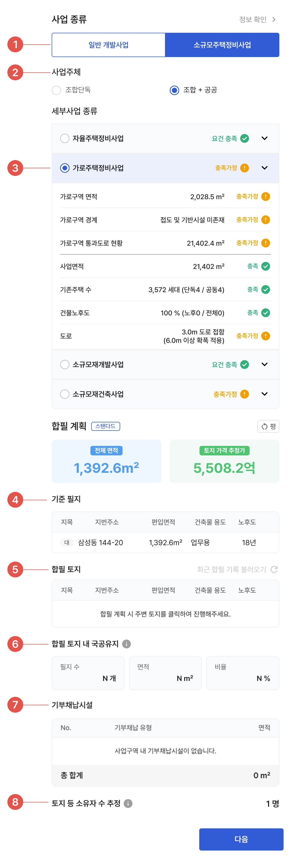 선택된 기준 필지의 변경이 없는 경우, 사업 조건을 변경하며 재검토 가능합니다.