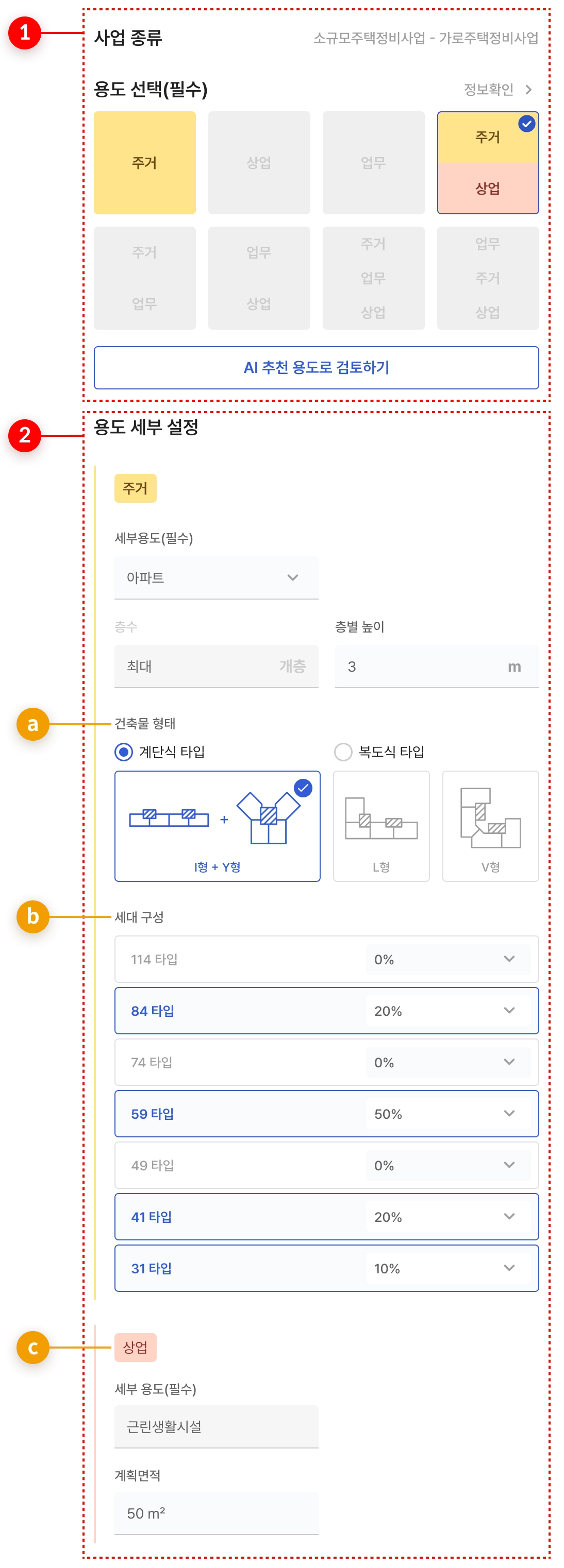 근린생활시설을 지원하여, 해당 사업에서 필요한 면적을 입력할 수 있습니다.