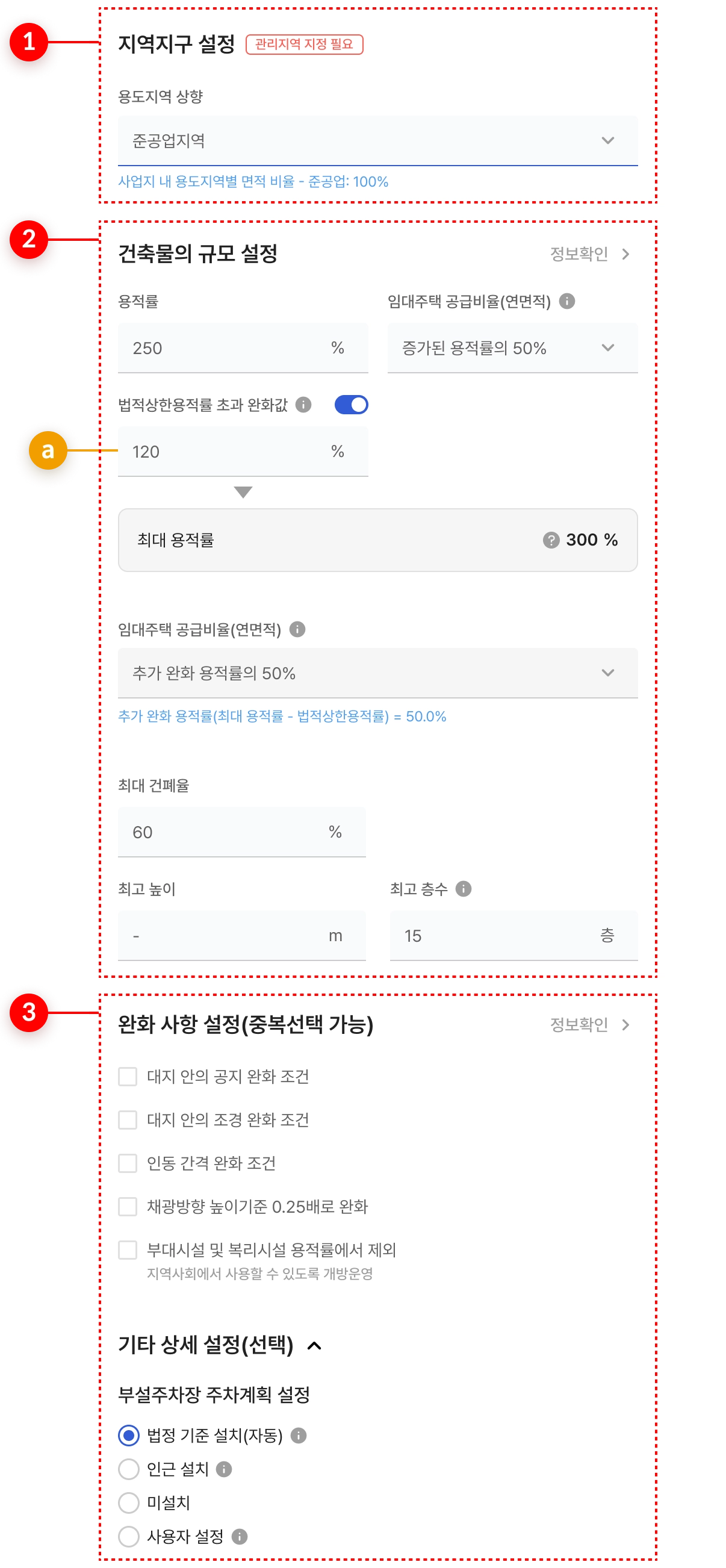 완화 사항 설정 및 기타 상세 설정도 주거지역과 동일하게 적용합니다.