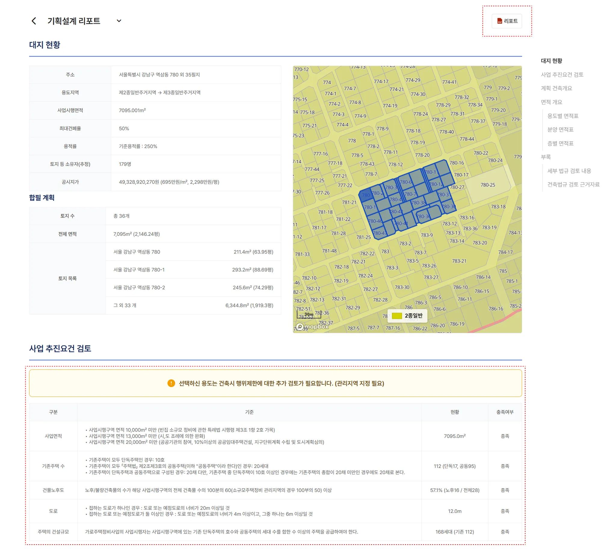 소규모주택정비사업의 토지조서 및 사업추진 요건에 충족여부를 리포트상 확인 가능합니다.