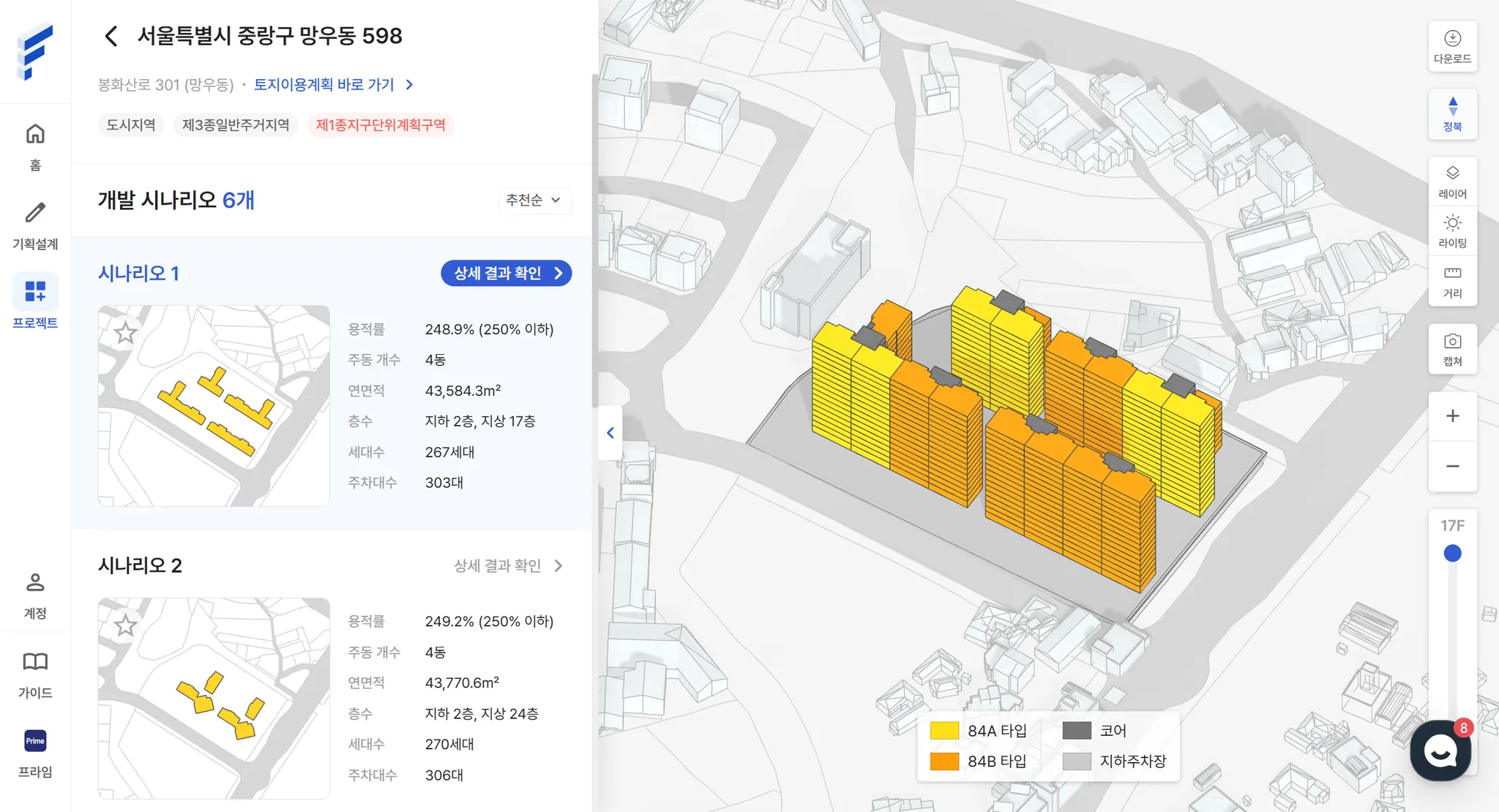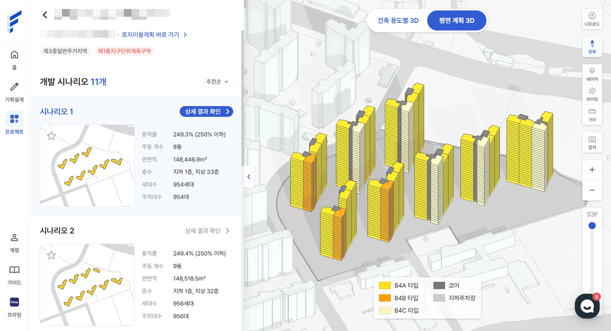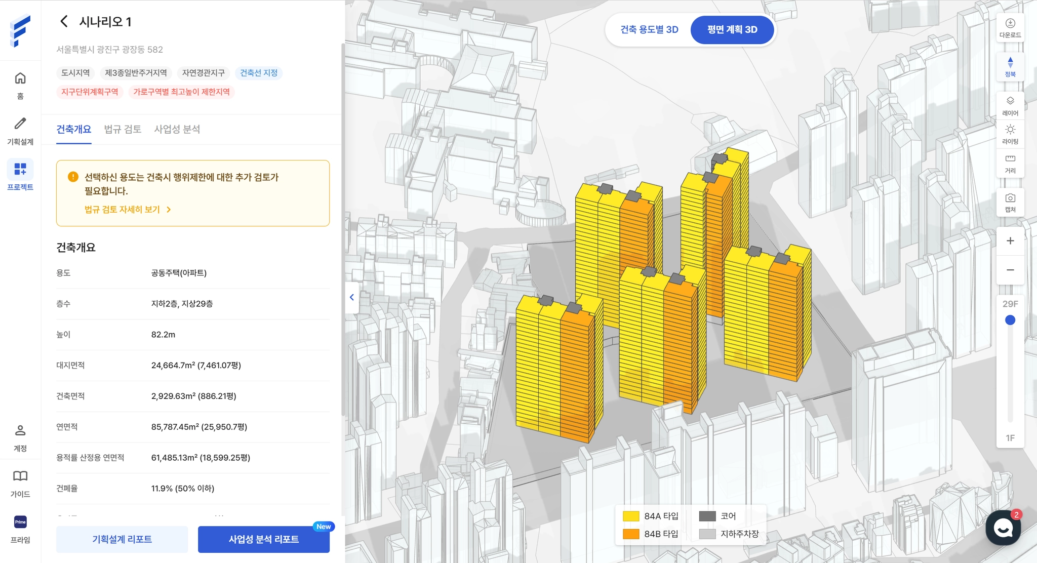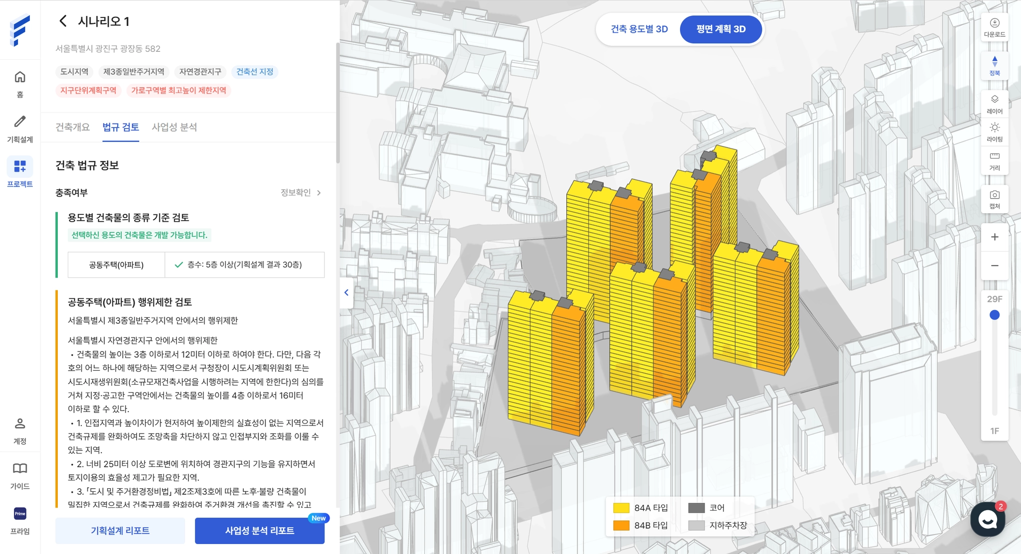 모든 설정이 완료된 후 “기획설계 실행”을 클릭하시면, 플렉시티가 공동주택 기획설계안을 도출합니다.