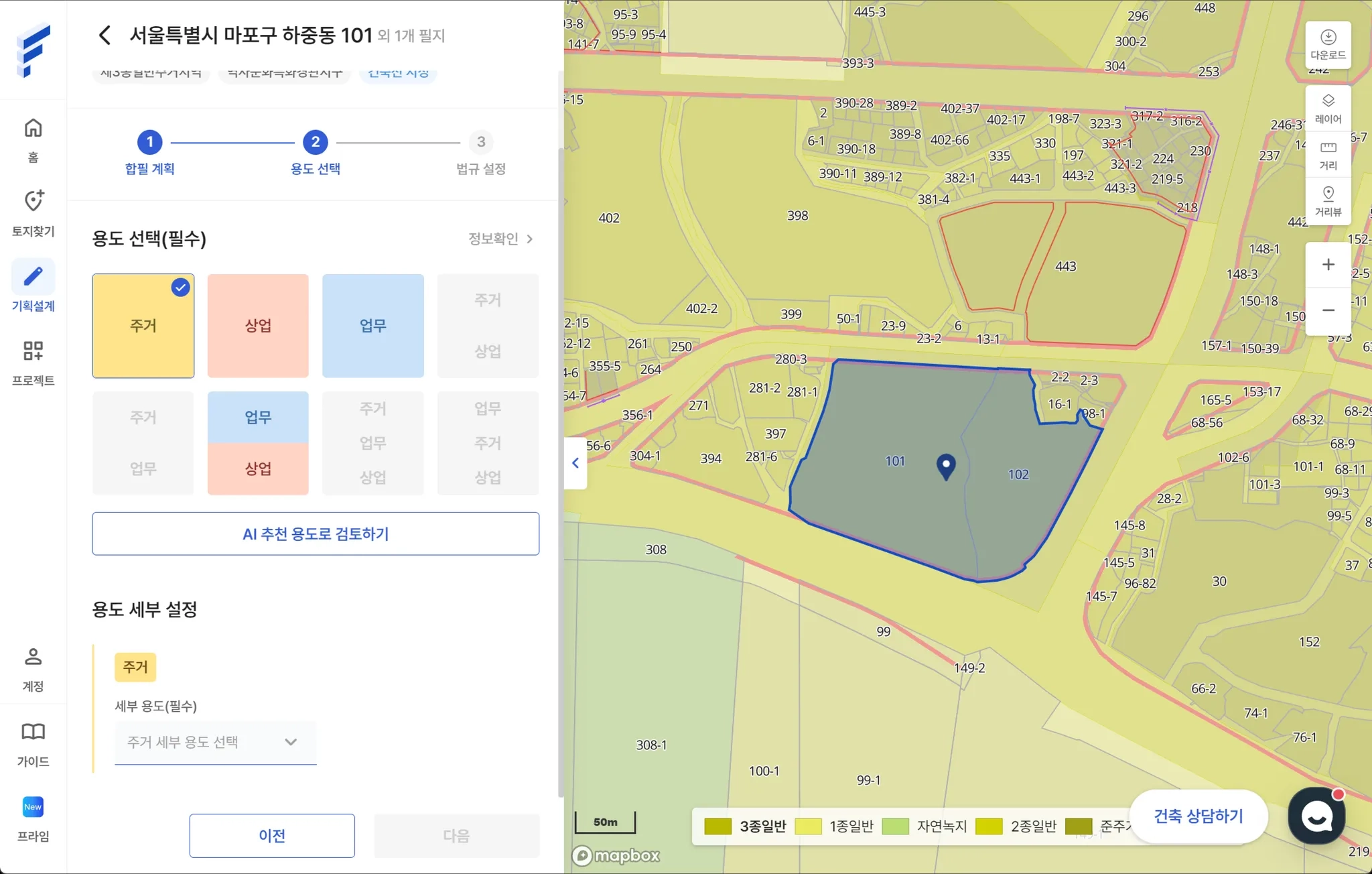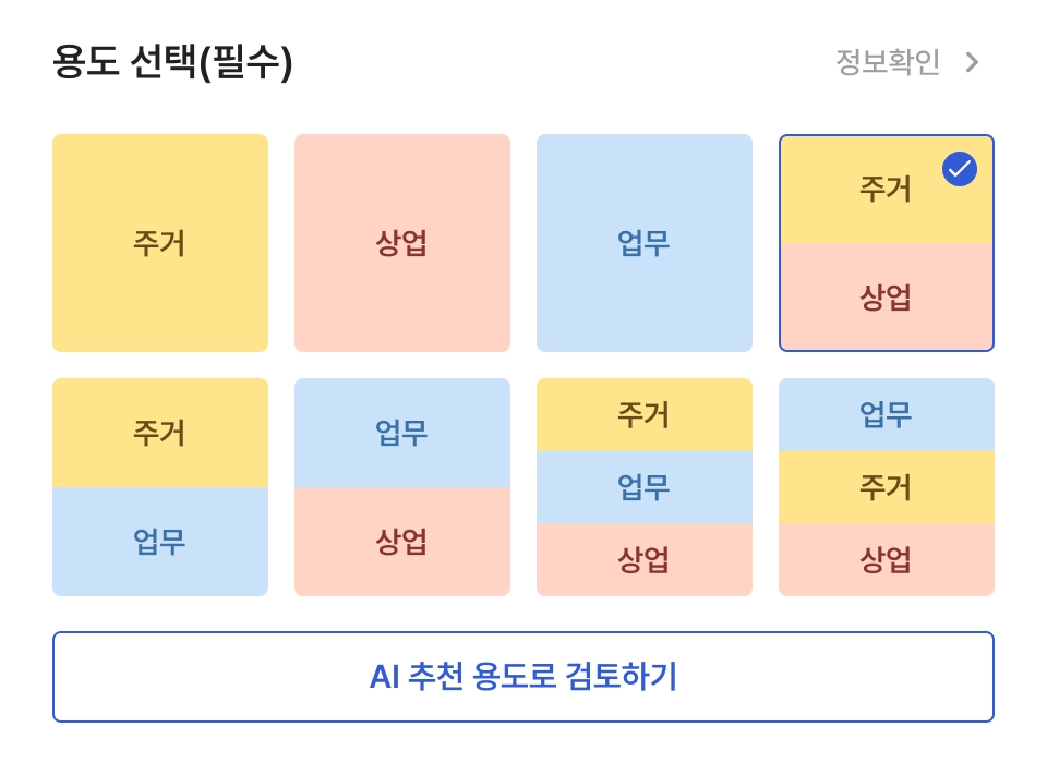 AI 추천 용도로 검토하기: 플렉시티가 추천하는 해당 토지의 최적 용도를 적용하려면 이 버튼을 클릭해 주세요.