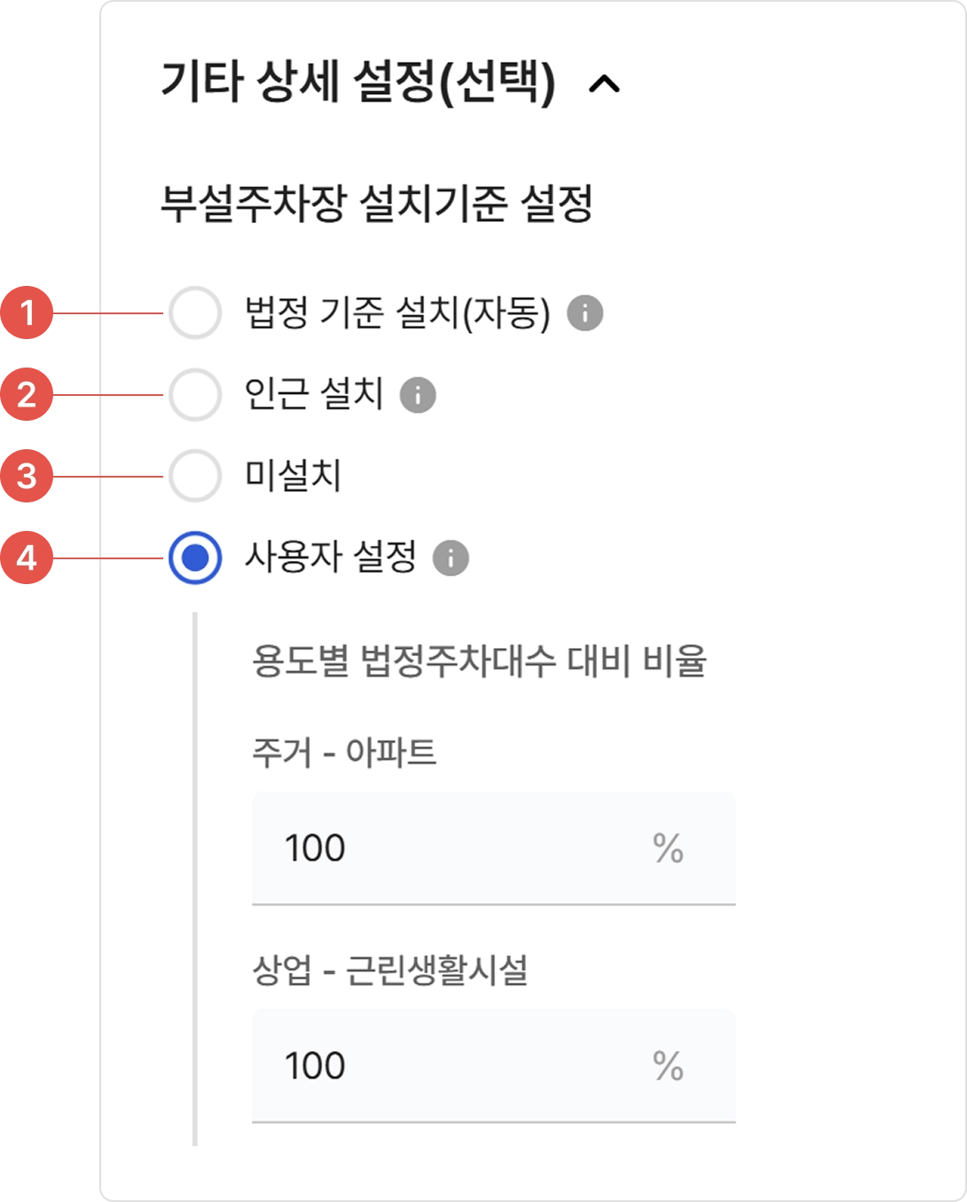 용도별 법정 주차 대수에 사용자가 입력한 비율을 적용하여 주차대수를 산정합니다.