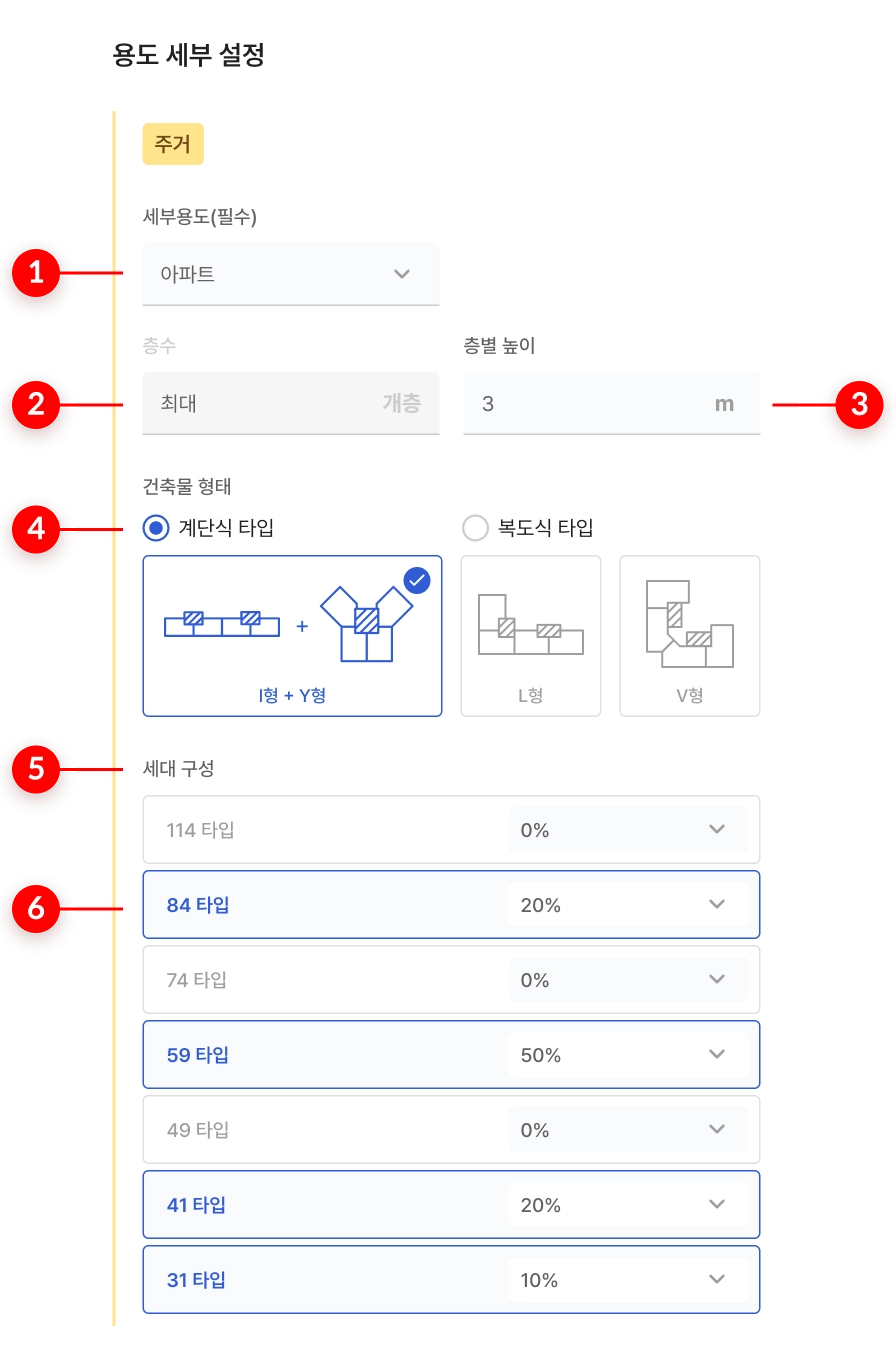 세부 설정에서 선택되는 용도는 건축법 시행령에 명시된 건축물의 종류를 기준으로 합니다.