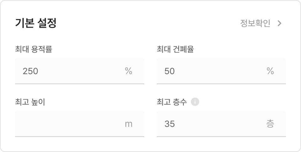 용적률, 건폐율, 높이, 층수 등 건축물의 규모에 대한 기본 설정값을 추가적으로 조절할 수 있습니다.