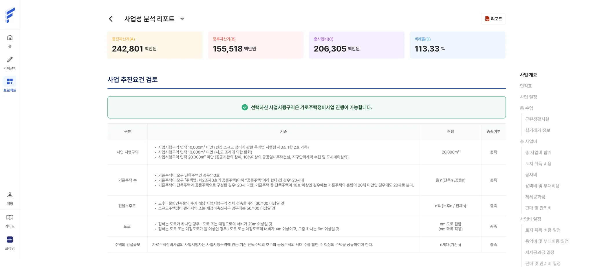 화면 우측 상단의 [리포트] 버튼을 클릭하면, 현재 보고 있는 사업성 분석 내용을 PDF 형식으로 저장할 수 있습니다.
