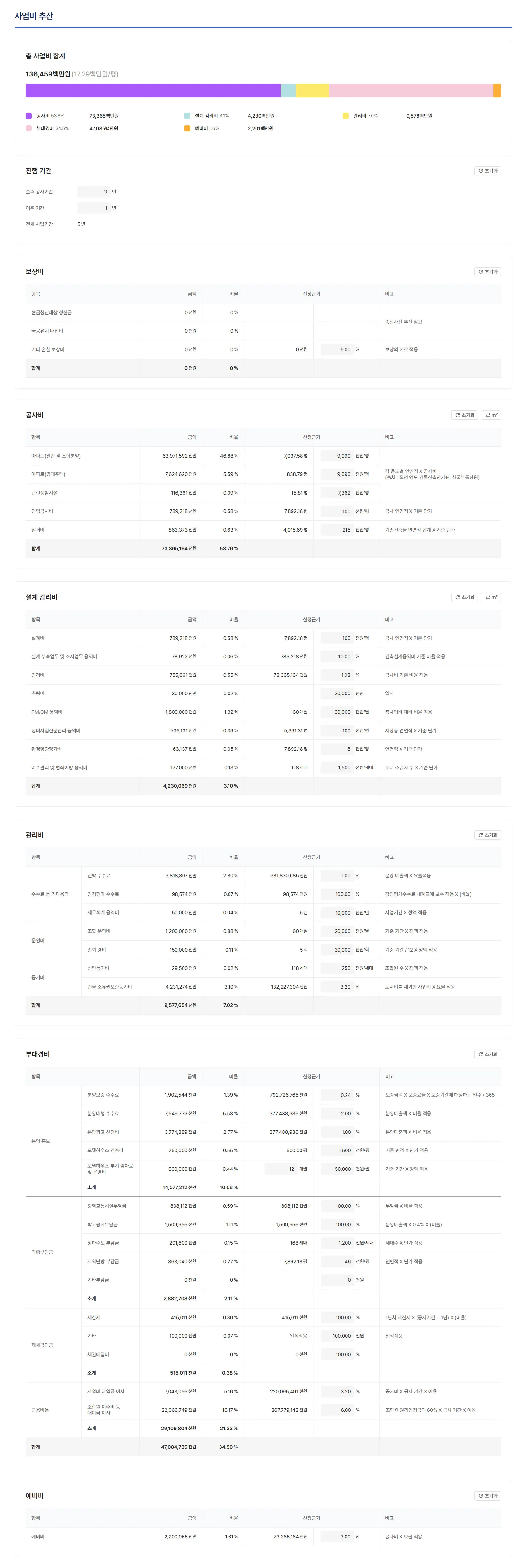 또한, 각 항목이 전체 사업비에서 차지하는 비율을 시각화된 그래프로 제공하여, 사용자가 비용 구조를 한눈에 파악할 수 있도록 돕습니다.