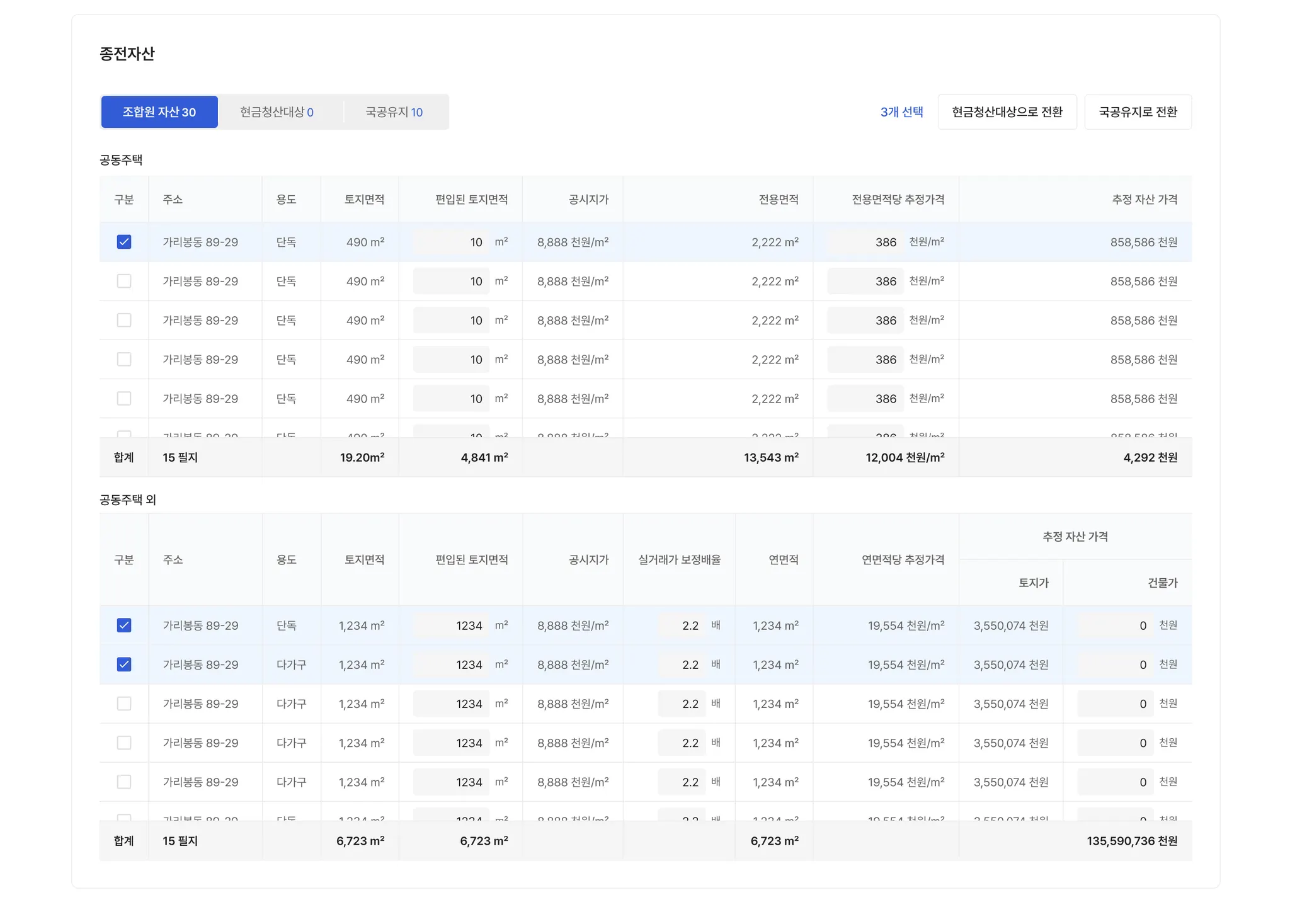 공공데이터를 기반으로 자동 분류되며, 국유지 또는 공유지로 등록된 필지는 종전자산 산정 대상에서 제외됩니다.