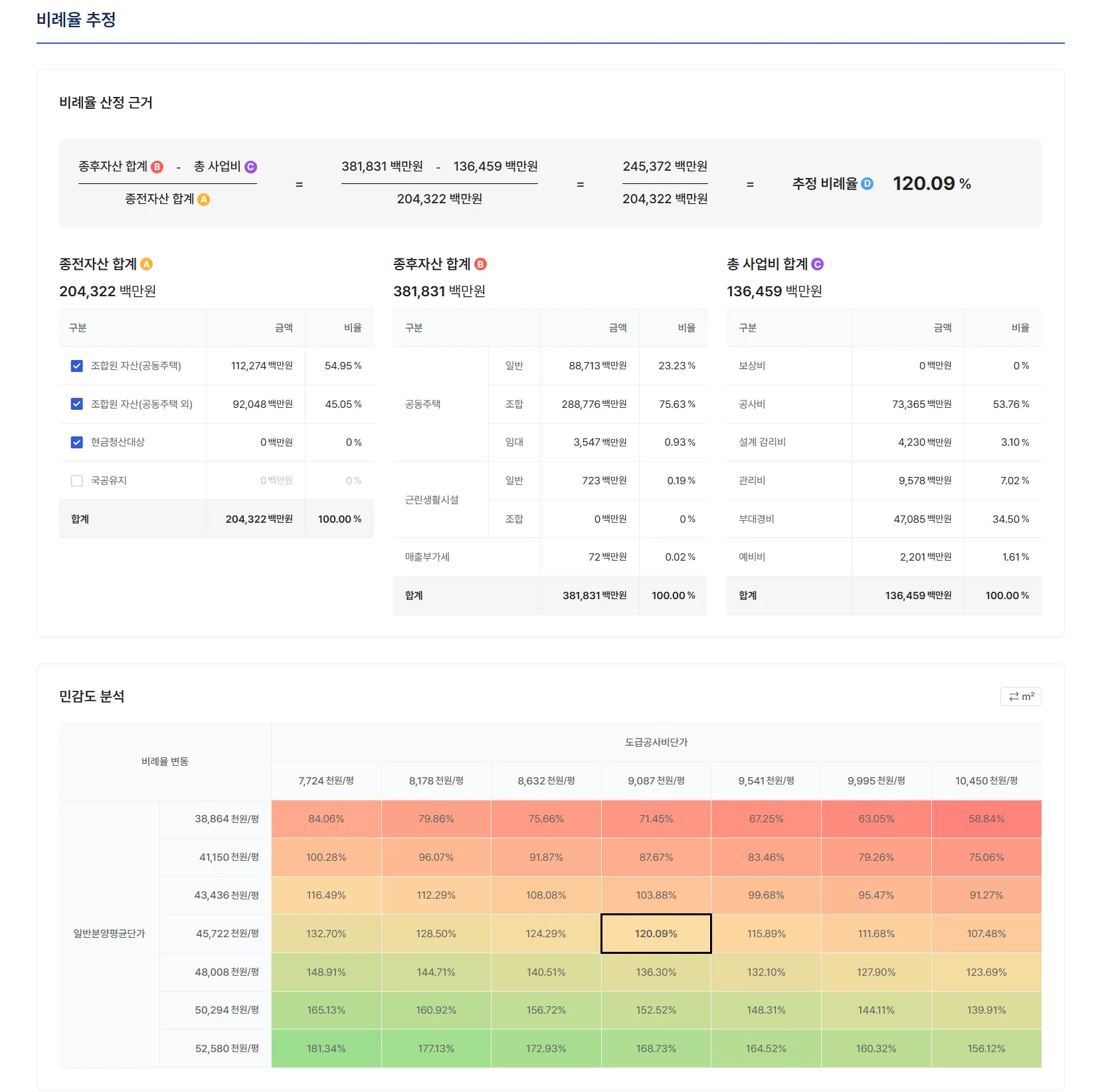 현재 산정된 비례율에 따른 민감도를 확인하실 수 있습니다.