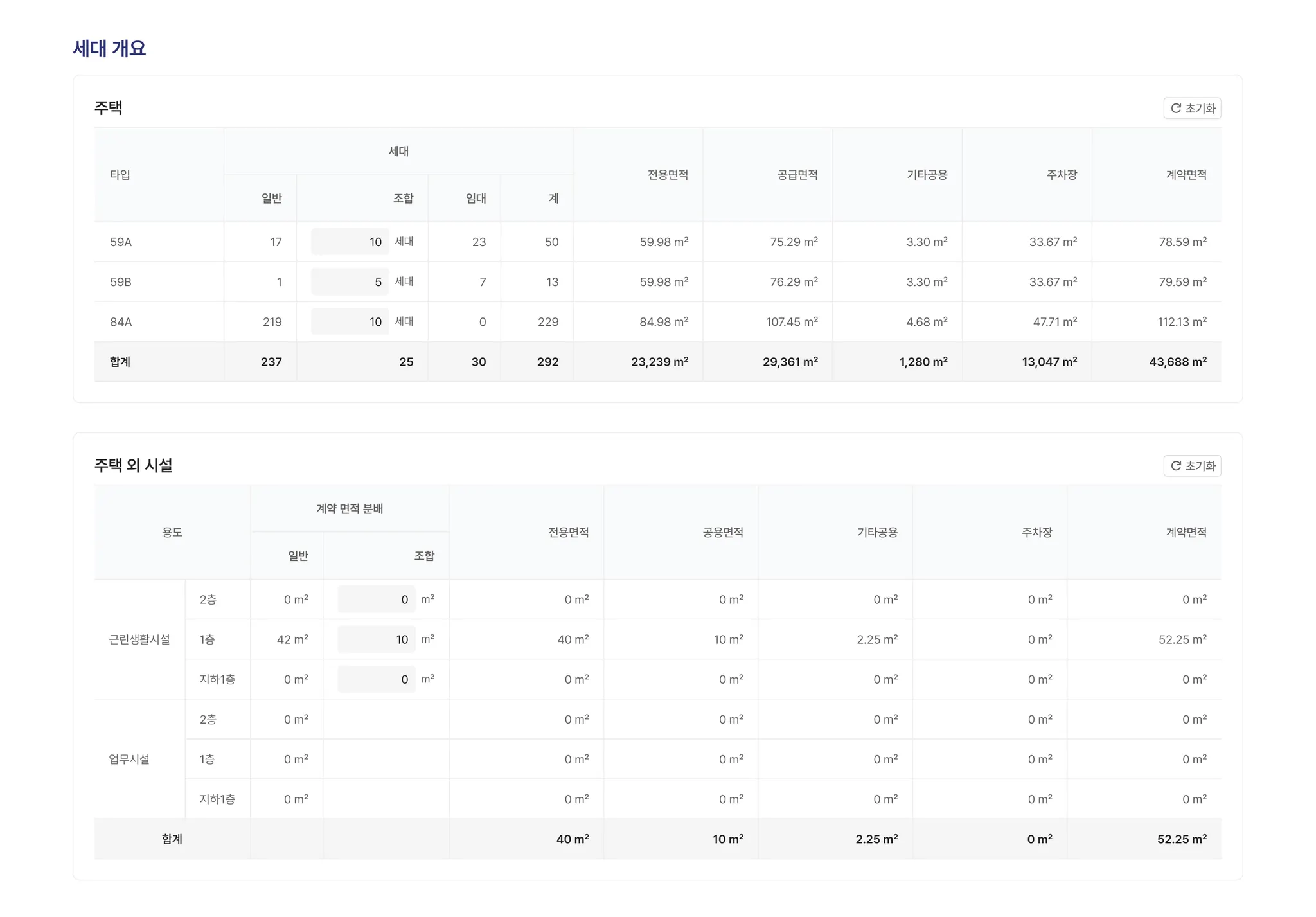 근린생활시설은 사용자가 입력한 면적을 기준으로 계획되며, 일부 면적을 조합원에게 배정된 면적으로 입력할 수 있습니다