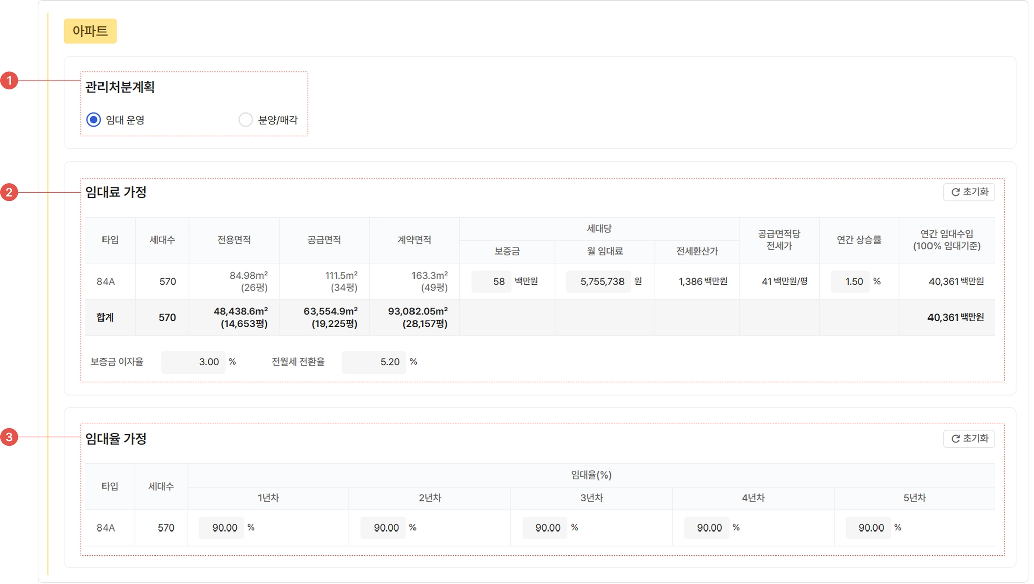 2. 임대료 가정: 세대타입별 보증금 및 월 임대료를 설정할 수 있습니다