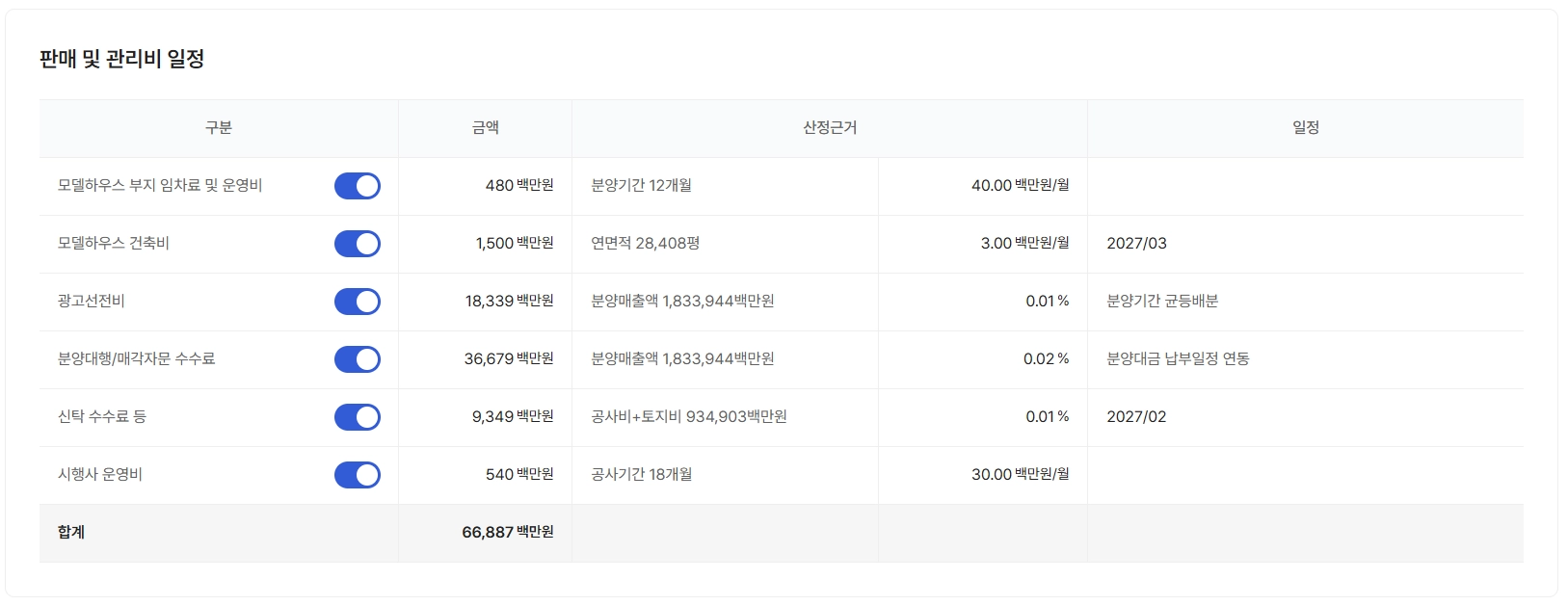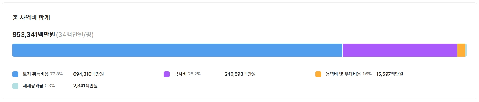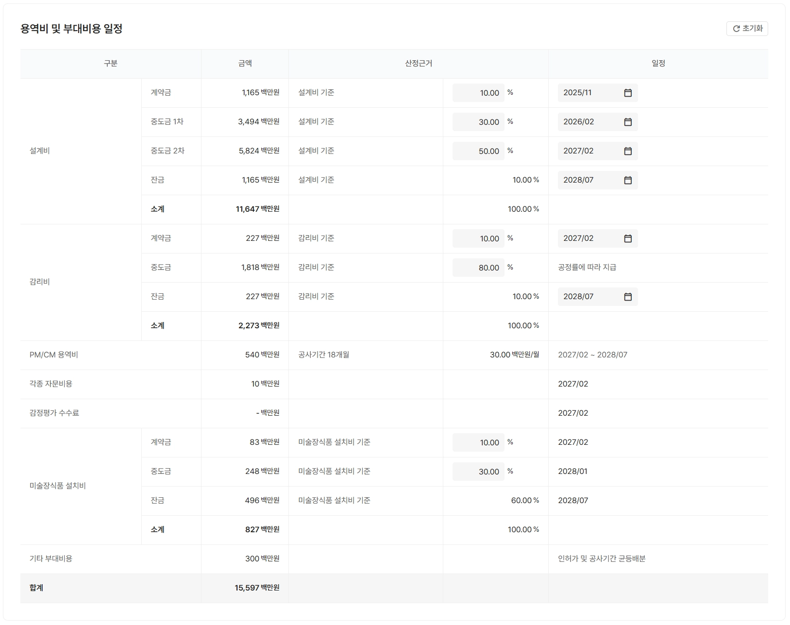 사업비 일정: 토지 취득 비용 및 용역비 및 부대비용의 일정 및 비율을 설정하실 수 있습니다.