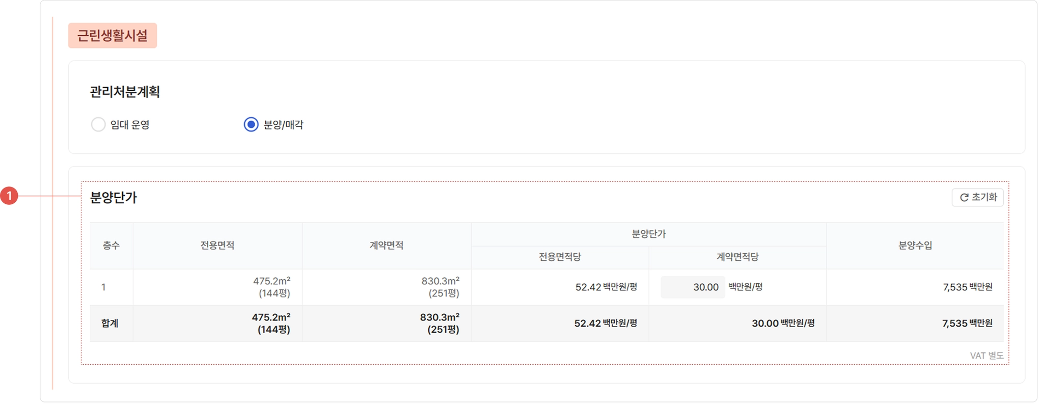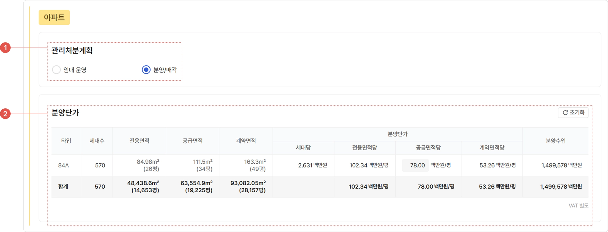각 세대별 임대료 및 분양단가를 설정하실 수 있습니다.