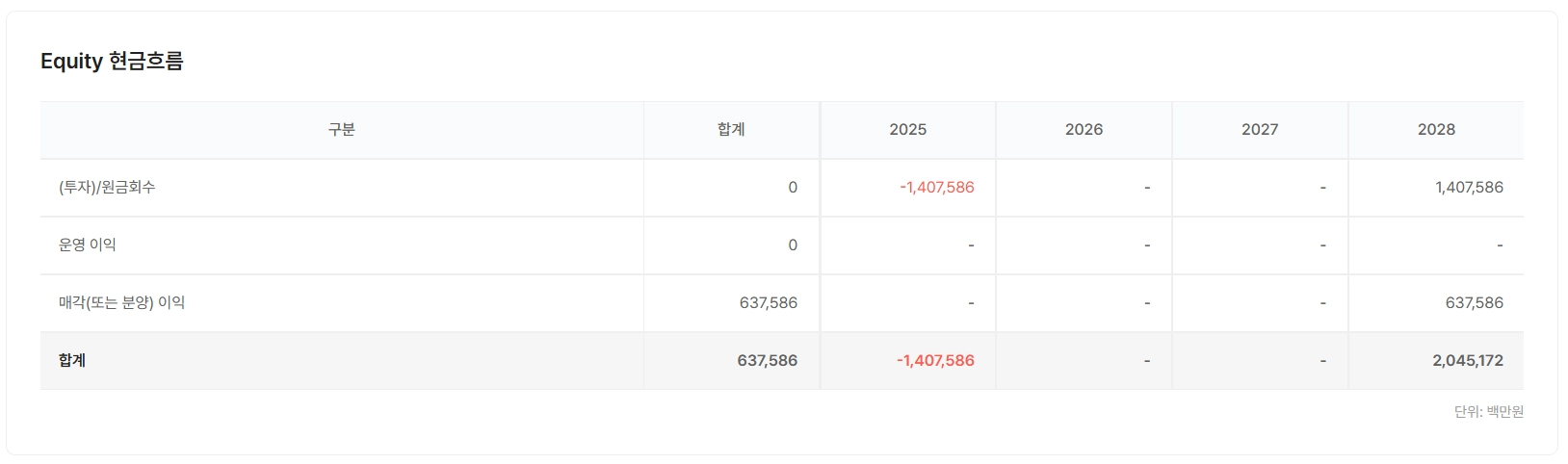 건축물 완공전까지 현금부족액이 발생할 경우 현금부족액 이 표기되며, Equity IRR 및 Equity Multiple 지표가 산출되지 않습니다