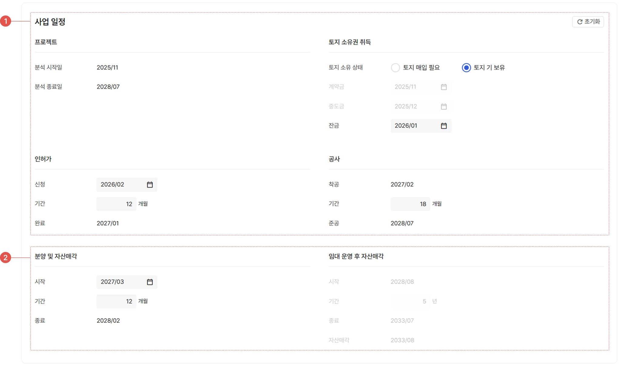 토지 취득 일정, 인허가 일정, 공사일정, 분양일정, 임대 후 자산매각 일정을 설정하실 수 있습니다.