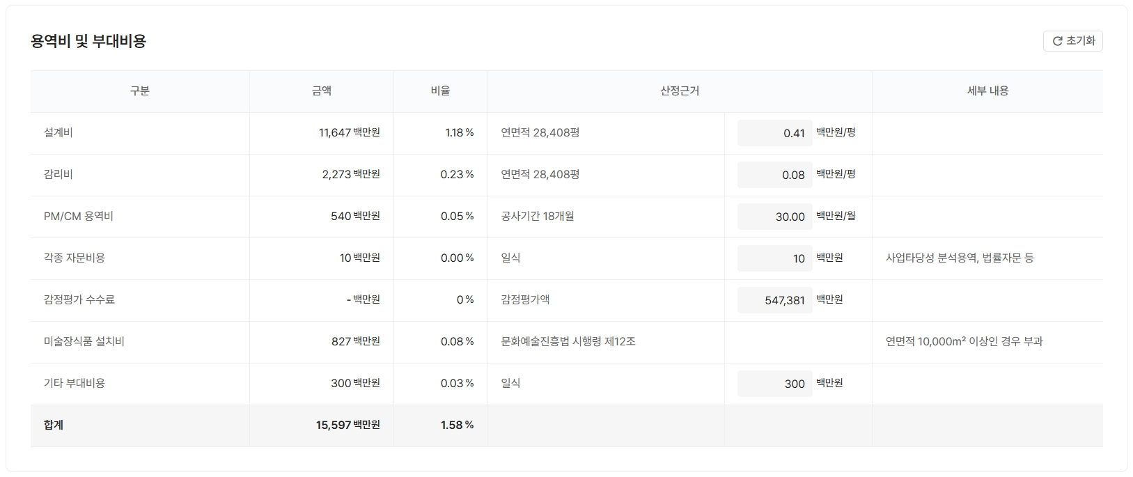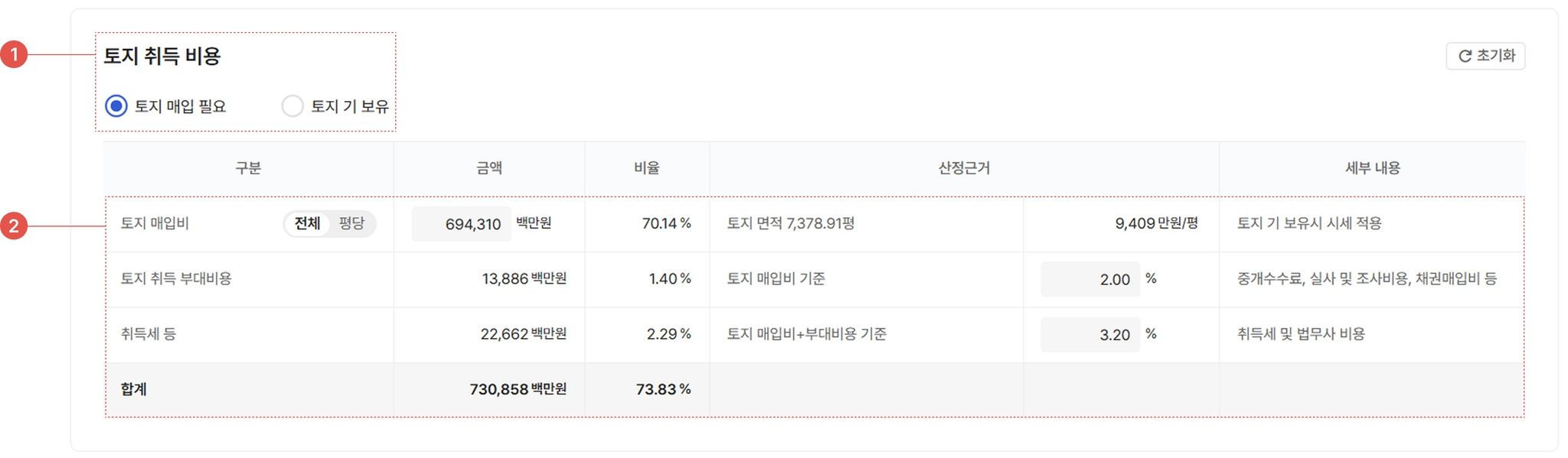토지취득비용, 공사비, 용역 및 부대비용, 제세공과금 등을 설정하실 수 있습니다.