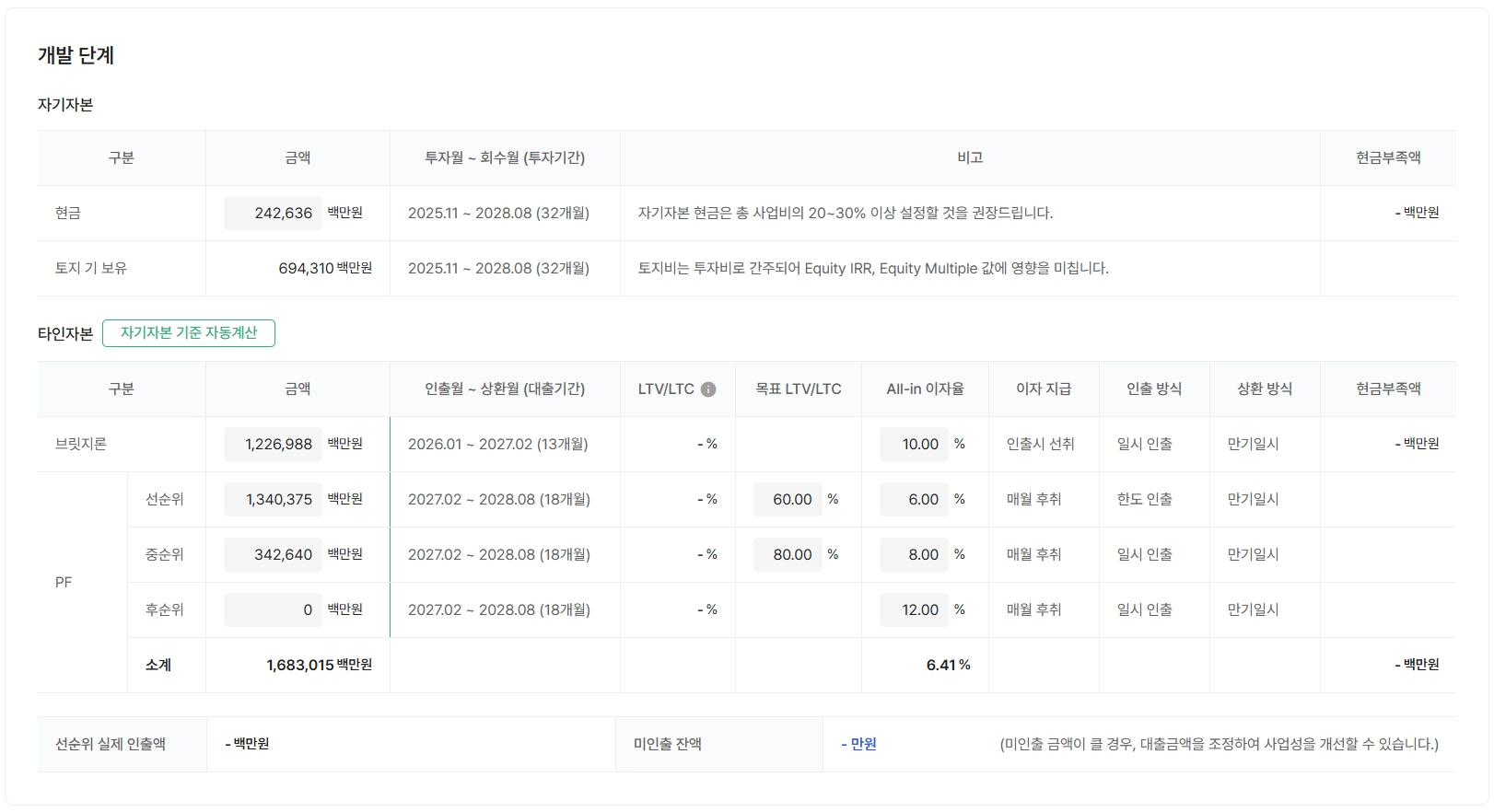 자기자본(현금 + 토지 기보유시 토지비)를 기준으로 목표 LTC/LTC와 이자율을 고려하여 타인자본을 자동계산합니다