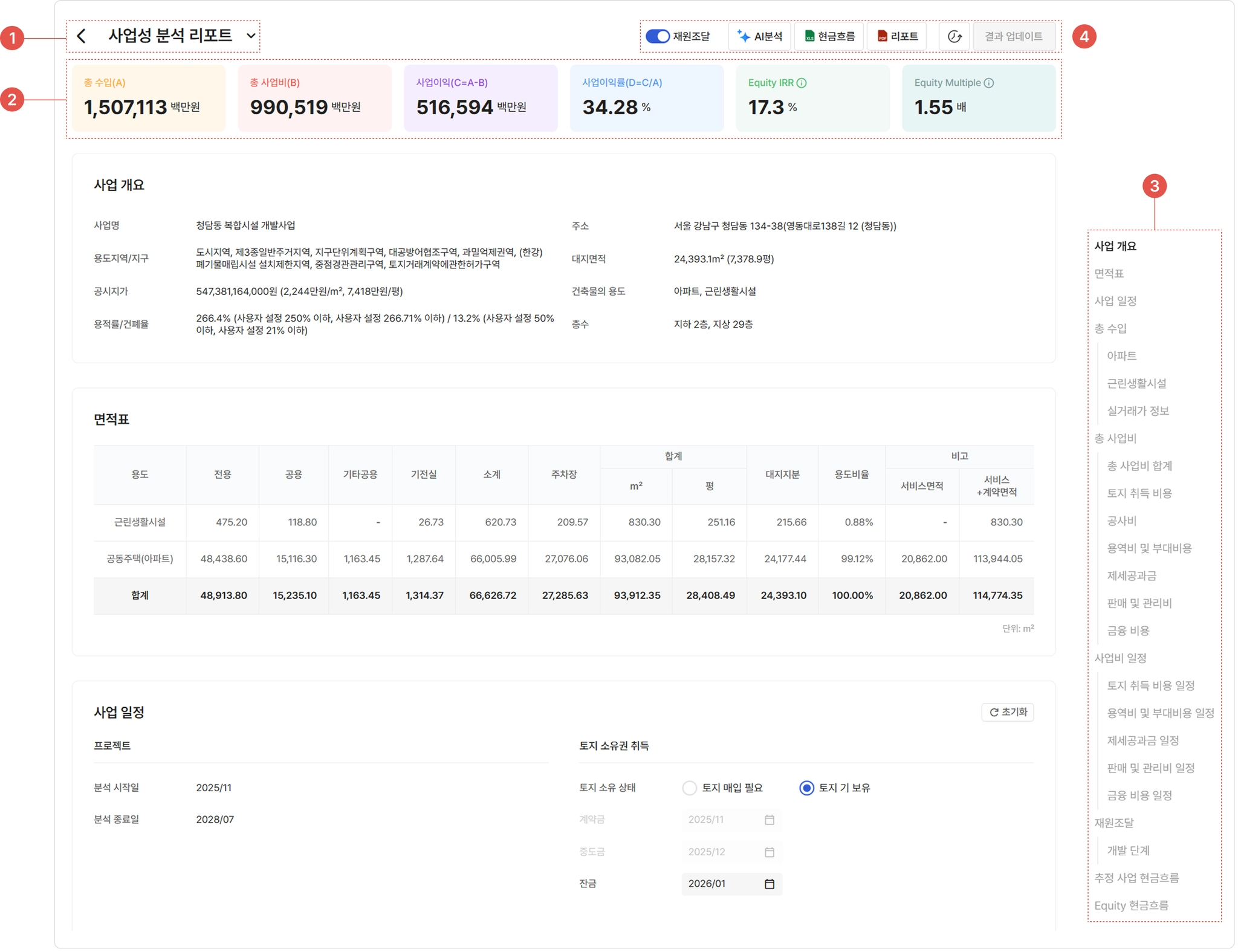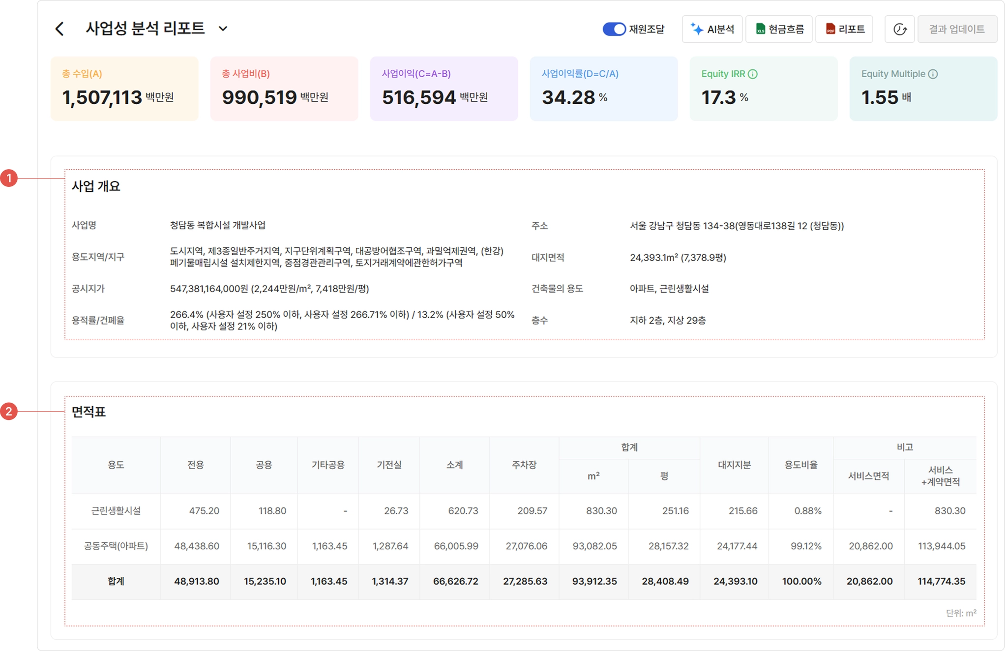 사업성분석 결과: 재원조달 고려에 따라 사업성 분석에 필요한 지표를 제공합니다.