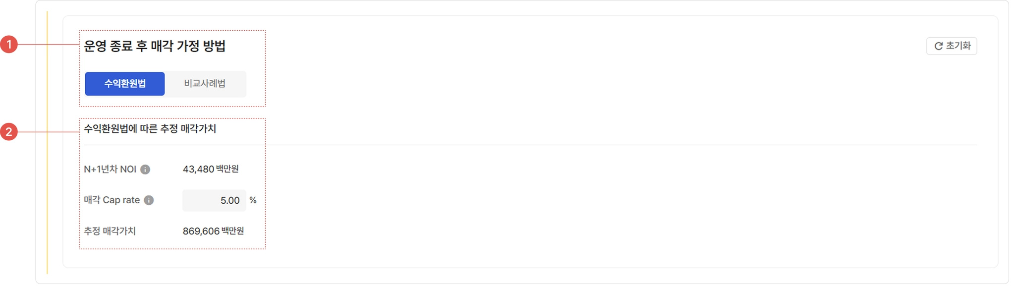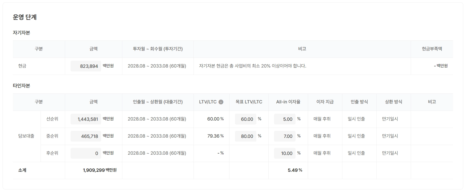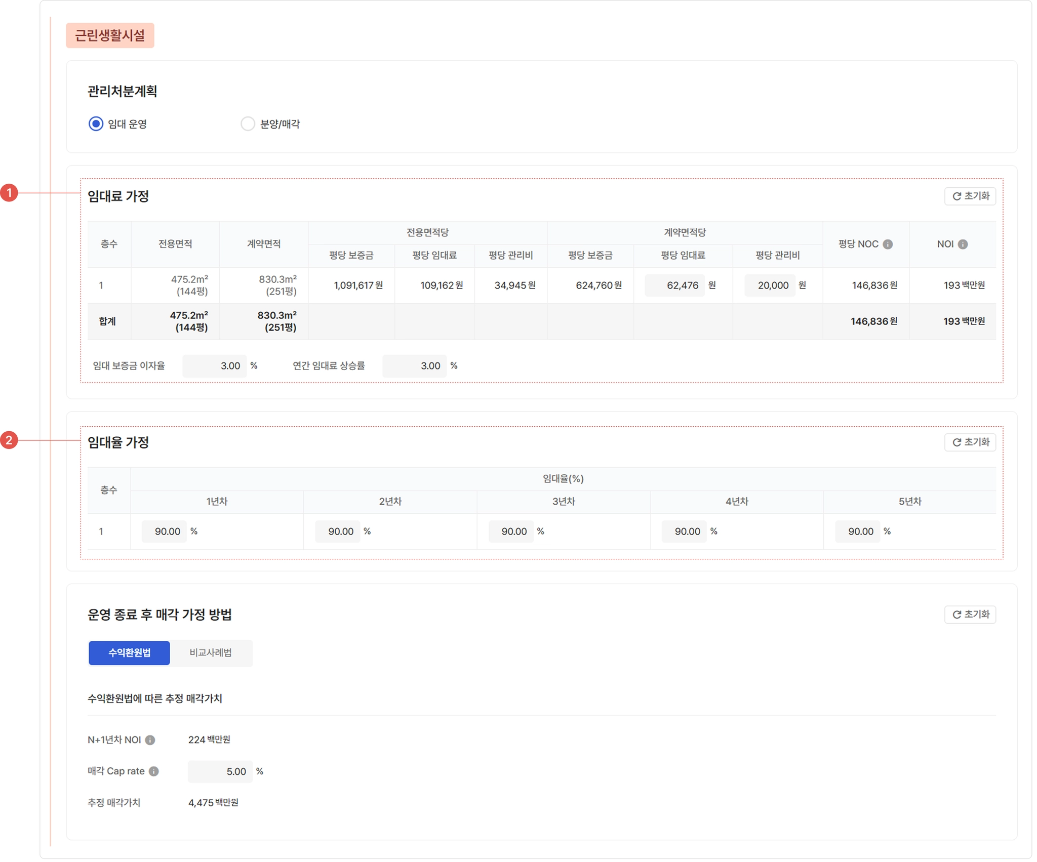 임대운영시 자기자본은 개발단계와 동일하게 기본값으로 제공되나 수정 가능합니다