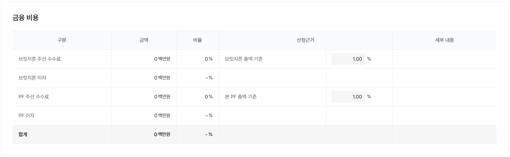 브릿지론 수수료 / 브릿지론 이자비용 / PF 수수료 / PF 이자비용을 포함합니다