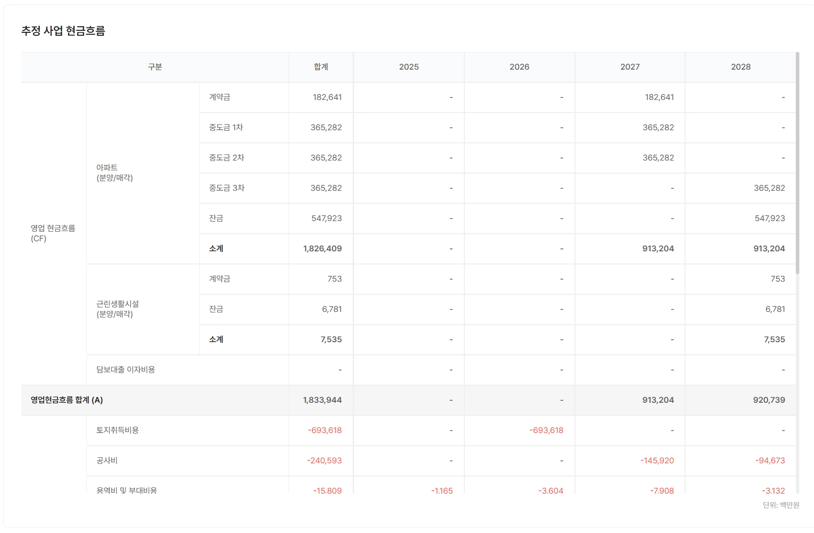 사업현금흐름 (기말현금)이 -값이 있을 경우 개발사업 진행이 불가능합니다.
