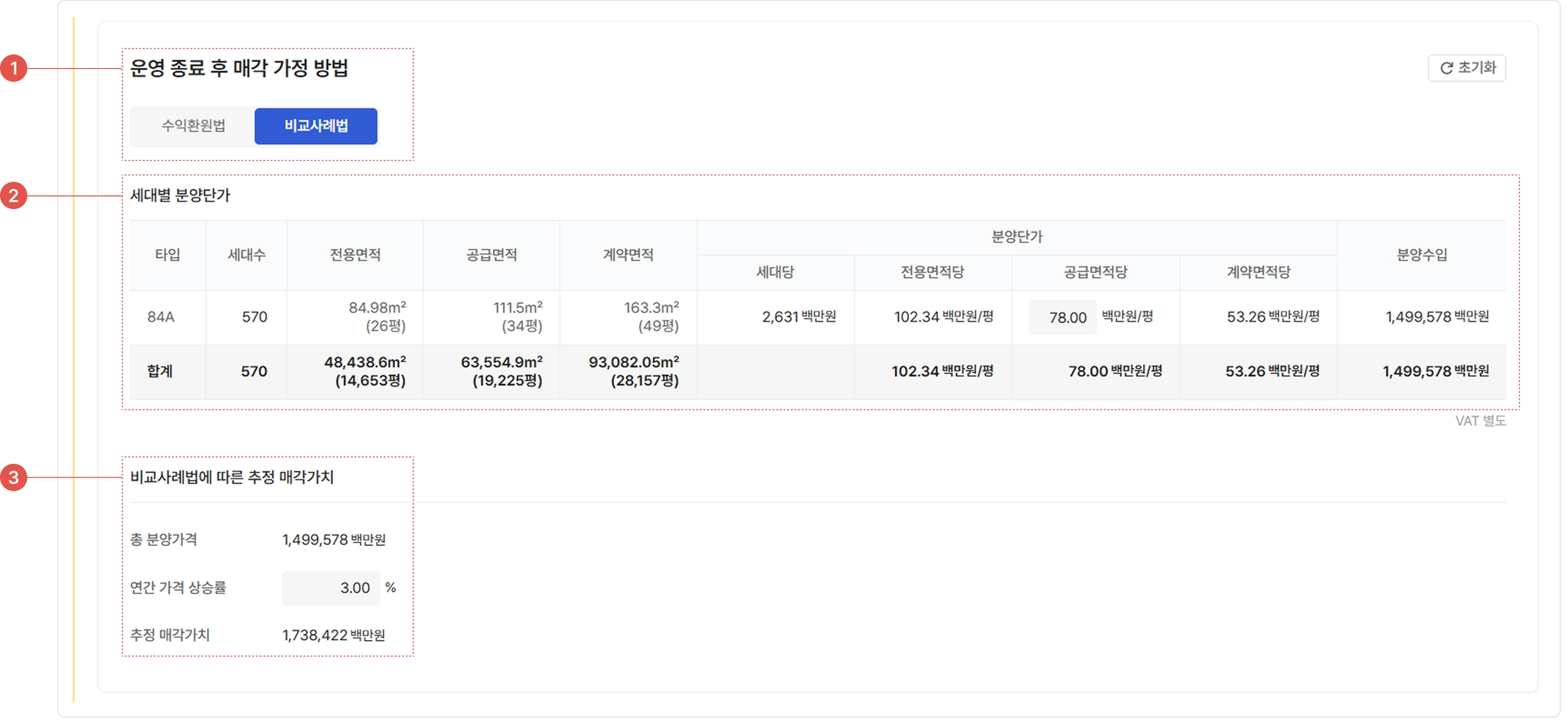 건축물의 용도별 관리처분계획을 설정할 수 있으며, 분양단가, 임대료 가정, 임대율 가정,운영 종료 후 매각가정을 설정할 수 있습니다.