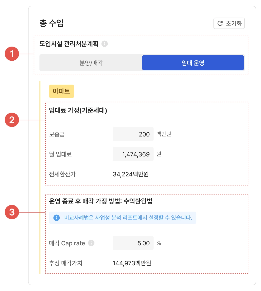 이 기능을 활용하면, 다른 가정(예: 매각 방식이나 임대 조건)을 적용해 여러 안을 손쉽게 비교·검토할 수 있습니다.