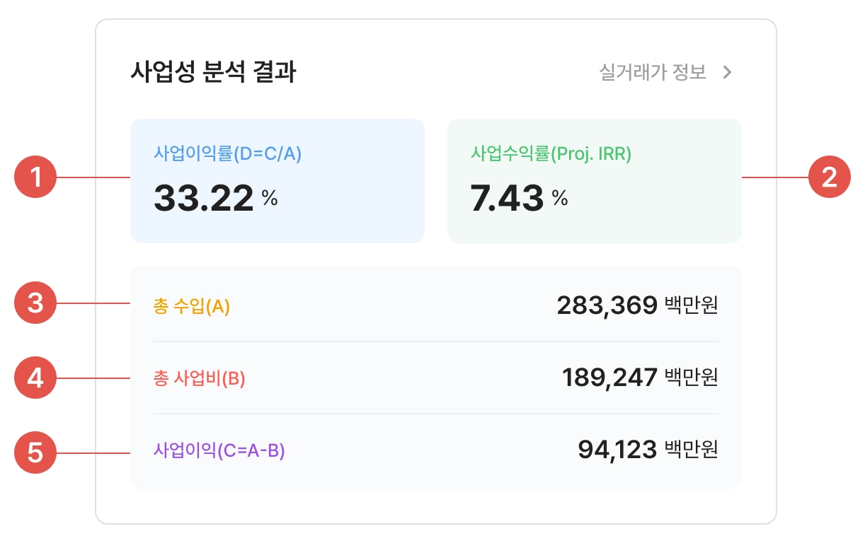 신축 후 “분양·매각” 또는 “운영 후 매각”을 가정하여 프로젝트의 현금흐름 기반 수익성 지표(IRR, 이익률 등)를 제공합니다.